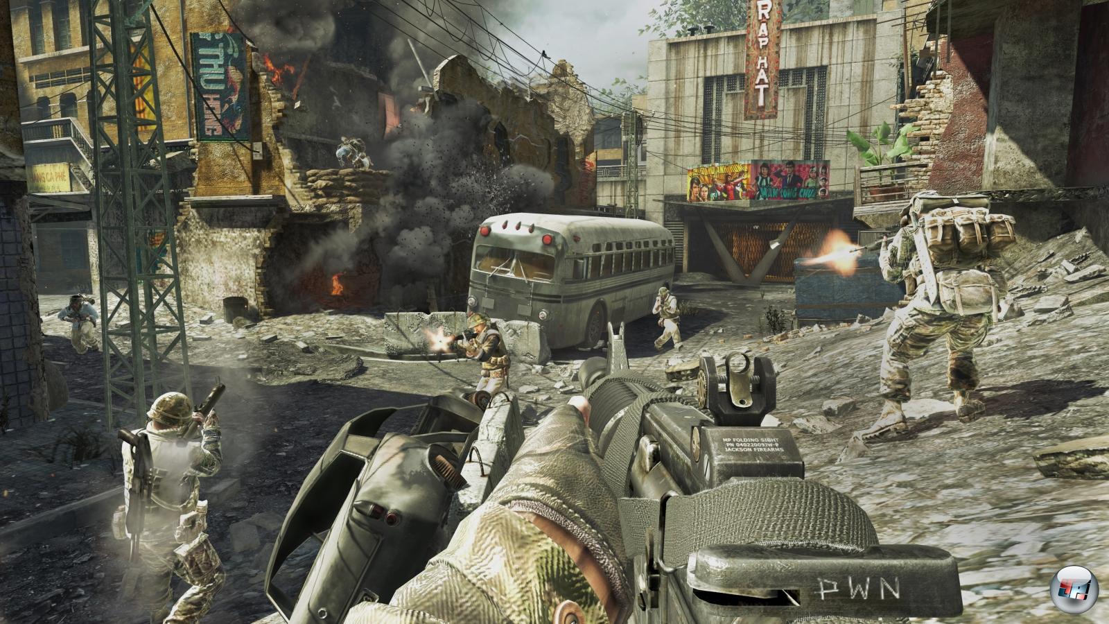 Die Levels sind serientypisch bis zum Bersten mit Skripten gefüllt, es kracht und wummst an allen Ecken und Enden, die Explosionen sind beeindruckend wuchtig, der Dschungel ist bemerkenswert dicht, die detaillierten Figuren sind meisterhaft animiert – besonders die ausdrucksstarken Gesichter stechen hervor. Außerdem, und das ist im Shooter-Bereich auf Konsolen eine absolute Seltenheit: durchgehend 60 superflüssige Frames pro Sekunde! Dieser Luxus wird allerdings mit einem Verzicht auf hochaufgelöste Texturen erkauft, was auf PS3 stärker auffällt als auf der 360; teilweise dauert es mehrere Sekunden, bis man Details erkennt, teilweise bleiben die Tapeten durchgehend matschig. Außerdem mögen die Gesichter toll animiert sein, aber für eine lippensynchrone Darstellung der Dialoge hat’s leider nicht gereicht. Außerdem fällt auf, dass der mittlerweile so alltägliche Wassereffekt hier ausnehmend hässlich geraten ist – jedenfalls wenn man unter Wasser schwimmt, was ein paar Mal der Fall ist. Die PC-Fassung bietet tradtiongemäß mehr Grafikoptionen, was ihr schlussendlich den Grafiksieg sichert: Auf höchster Detailstufe sind ehemals verwaschene Texturen knackescharf, die Gesichter sind detailreich, die Effekte gewinnen nochmals an Wumms – die Konsolenfassungen tummeln sich etwa auf der »Mittel«-Einstellung. Allerdings verlangt Black Ops für das komplette Grafikerlebnis inklusive anisotropischem Filter und vollem Anti-Aliasing auch eine enorm leistungsfähige Hardware. Die konstanten 60fps der Konsolenfassungen sind hier mit Otto-Normal-Hardware selbst auf der mittleren Detailstufe kaum zu schaffen, was gerade im Mehrspielermodus schnell zum Nachteil werden kann.