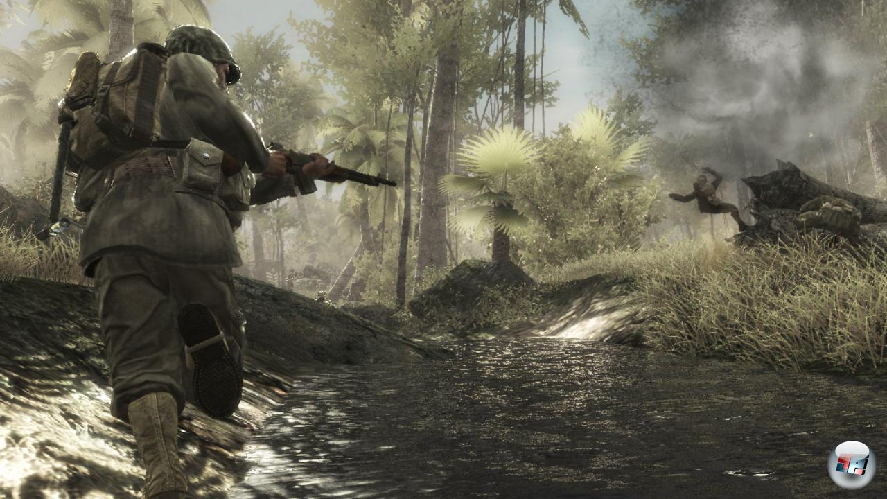 Eines muss man den Jungs und Mädels von Treyarch lassen: Sie wissen, wie man Schlachtfelder inszeniert. Der Detailgrad der Levels ist beeindruckend hoch, in den dicht bewucherten Wäldern schwanken abwechslungsreiche und liebevoll gestaltete Bäume im Wind; kokelt man ein paar davon mit dem Flammenwerfer an, fackelt das Gewächs nach und nach immer weiter ab und zerfällt, während der Wind loderndes Geäst und feurige Partikel wegbläst – nicht ganz so beeindruckend wie in Far Cry 2, aber nichtsdestotrotz toll inszeniert! Speziell die Effektabteilung hat hervorragende Arbeit geleistet: Explosionen und Beleuchtung sind verteufelt gut, wenn z.B. im düsteren Wald des Startlevels unerwartet eine Leuchtrakete aufsteigt und damit das graue Szenario in ein geisterhaftes Zwielicht taucht, in dem die Schatten verrückt spielen, während von allen Seiten schreiende Asiaten auf die eigene Truppe einstürmen, dann gewinnt das in mancher Hinsicht fast schon altmodische Spiel ganz neue Qualitäten. Und das Schönste daran: Die Geschwindigkeit ist stets wunderbar hoch, auf 360 und PS3 geht die Action nie in die Knie, auf dem PC braucht’s keine Über-Rechner, um den vollen Detailgrad genießen zu können – sehr schön! Nicht ganz so schön sind dagegen Einzelheiten wie z.B. der sterile Panzer-Level, der vor allem mit sehr kurzer Clipping-Distanz des Grases abschreckt – oder die Abwechslungsarmut der Gegner.