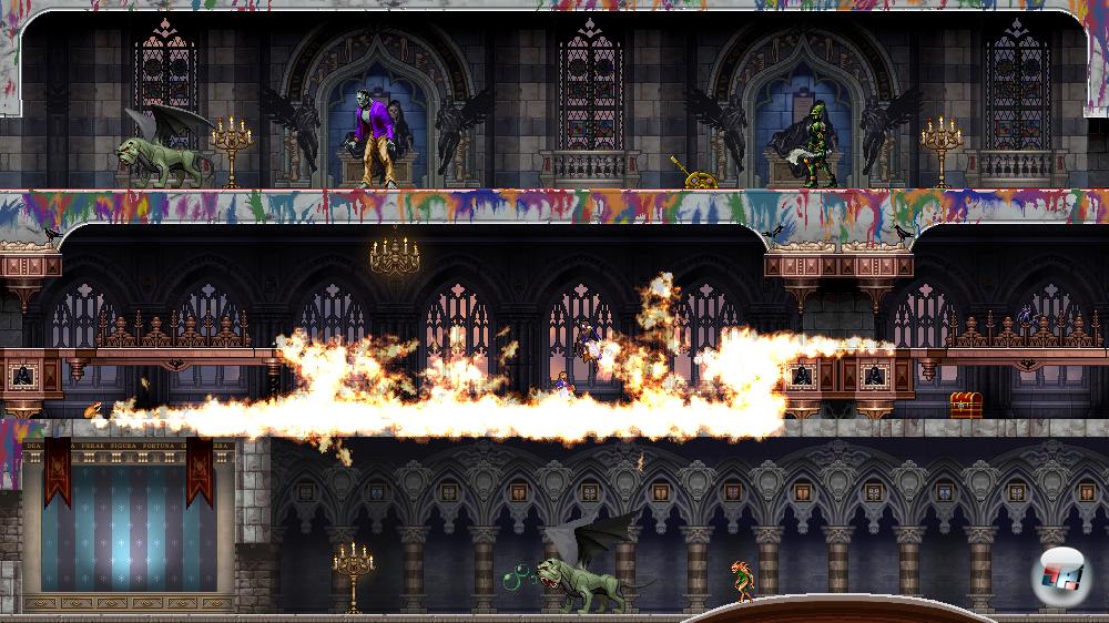 Sondern eher, weil die auf Action und Geschwindigkeit getrimmten Mechaniken dem bekannten Einzelspieler-Erlebnis so gar nicht entsprechen. Erforschung fällt flach, Rätsel gibt es außerhalb von kooperativen Schalterkombos nicht, die Charakterentwicklung wurde minimiert und reduziert sich meist auf den Erwerb neuer Gegenstände im Shop, die die Figurenwerte verbessern und so die Überlebenschancen erhöhen. Dazu hat man sich irgendwann an den Umgebungen sattgesehen: Nicht nur, weil sie im Vergleich mit anderen Castlevanias klein ausfallen. Sondern vor allem deshalb, weil alle Level-Texturen und sonstige Versatzstücke den bereits veröffentlichten Teilen entstammen und mitunter schon zehn Jahre auf dem Buckel haben. Und dieses Alter merkt man dem CHD-Artdesign an.
