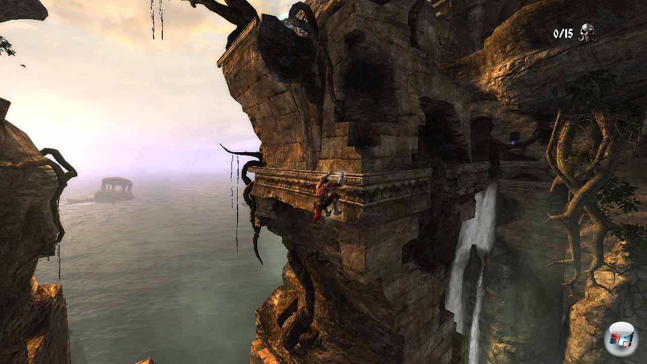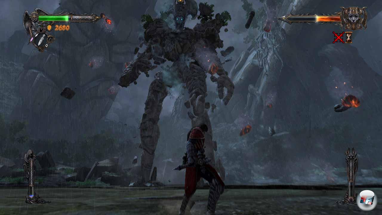 Allerdings eine gute, fast schon eine Art Kujau, der handwerklich exzellent einige Meister nachahmte. Denn der zweite Koloss, eine aus zig Bruchstücken bestehende Statue, die sich langsam zusammen setzt und mächtige Felsen auf Gabriel wirft, die er mit dem passenden Timing zurück schleudern muss, weiß zu beeindrucken. Auch hier muss man sich aus der Ferne nähern, wenn dieser Bildschirm füllende Gegner in die Knie sinkt, muss dann an seinen Armen und Beinen empor klettern, Wunden in die markierten Bereiche schlagen und letztlich bis zu diesem edlen Gesicht klettern, das wie eine Arena für sich irgendwo zwischen den Wolken thront – das macht Spaß, das erinnert an Shadow, aber wird innerhalb der zwölf Kapitel nicht zu arg strapaziert.