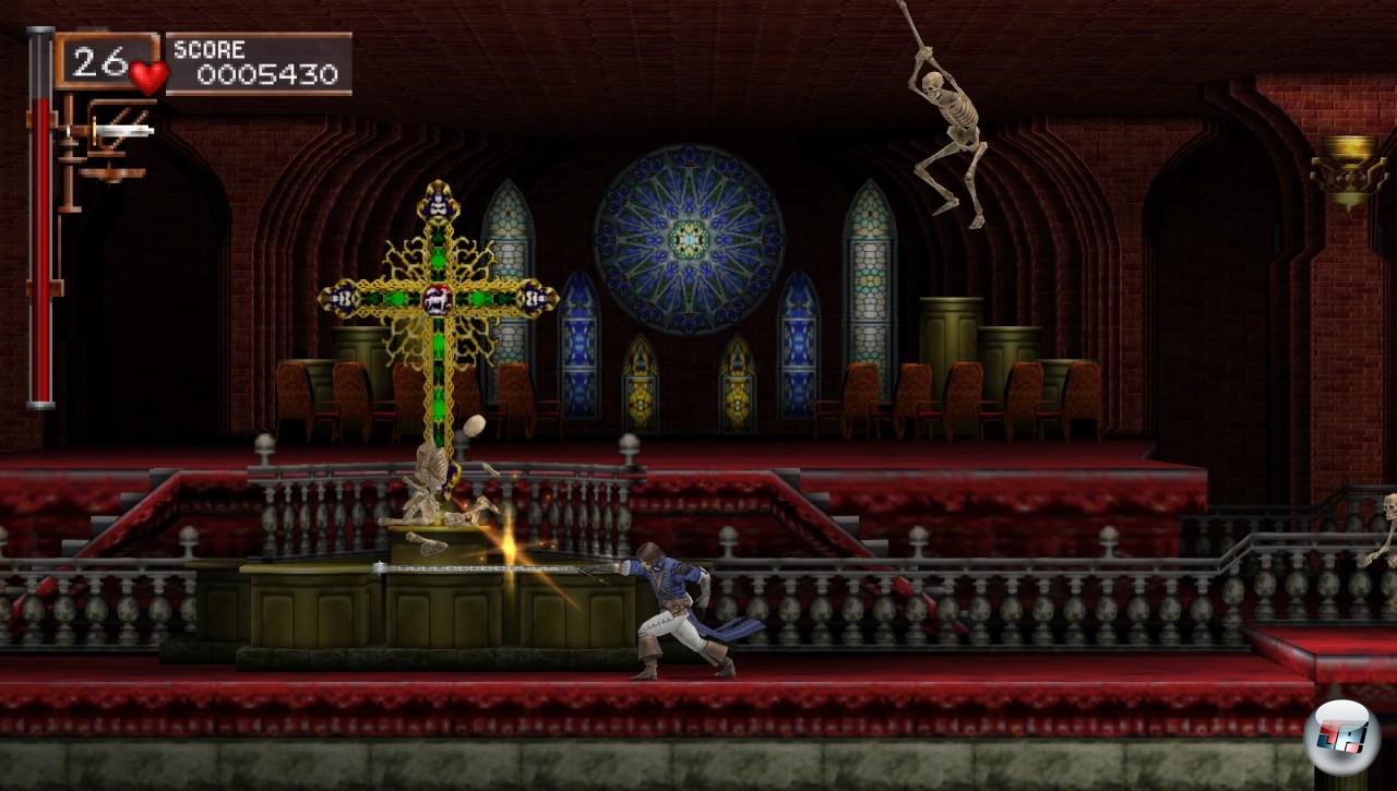 Als klassisches Castlevania folgt DX klassischen Design-Tugenden: Die neun Levels scrollen linear von links nach rechts (oder auch mal umgekehrt), ihr durchschreitet Türen, um zu neuen Abschnitten zu gelangen, findet Extrawaffen sowie heilsame Nahrung in Kerzen und bröckeligen Mauern. Neben der Peitsche, die genau in eine Richtung schnalzen kann, nämlich nach vorn, könnt ihr noch Wurfmesser, Äxte, heiliges Wasser oder Wurf-Kruzifixe gegen die Feindesheere einsetzen – nur nicht alle auf einmal, denn ihr dürft immer nur eine Sekundärwaffe mit euch herumschleppen, deren