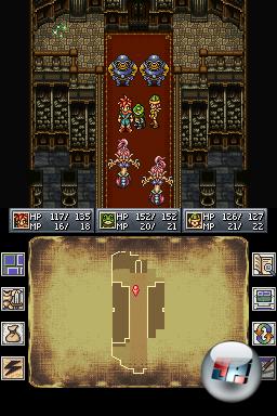 DS-Spieler dürfen sich sogar entscheiden, wie die beiden Bildschirme des Handhelds im Kampf genutzt werden sollen. Neben einer klassischen Ansicht gibt es auch eine übersichtlichere Variante, die sämtliche Menüs auf den unteren Teil verbannt, wo man sie wahlweise via Steuerkreuz und Tasten oder Stylus bedienen kann. Ansonsten fungiert der untere Bildschirm als praktische Automap oder Gesamtkarte, über die man sich ebenfalls per Touchscreen bewegen kann. Da damals wie heute allerdings keine diagonalen Bewegungen möglich sind, steuert es sich per D-Pad deutlich einfacher und präziser, so dass man auch in Kämpfen nicht extra den Stylus heraus kramt. Stets zwischen beiden Methoden wählen und diese sogar kombinieren zu können, ist aber genauso lobenswert wie die individuelle Anpassung des Kampfsystems.
