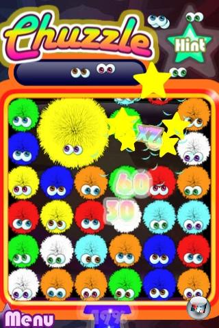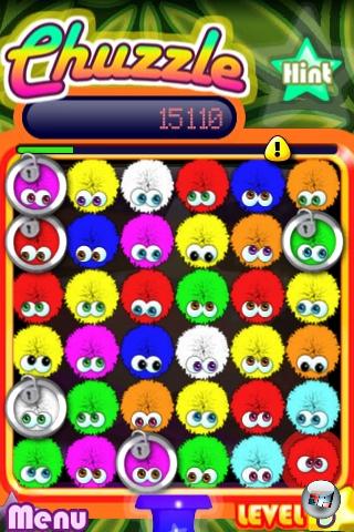 Ein Chuzzle ist klein, flauschig und explosiv: Tummeln sich mindestens zwei identisch aussehende Kumpels in seiner unmittelbaren Nähe, löst er sich mit einem quietschigen »Plopp!« sowie allerlei schwirrendem Fussel-Gefieder in Luft auf, während von oben herabfallende Fusselbälle die frei werdenden Plätze einnehmen. Zurück bleiben nur seine Augen, die in eine Flasche wandern. Ist diese Flasche gefüllt, geht es in den nächsten Level. Klingt simpel, nicht? Ist es ja auch; eine Variation des guten alten »Match 3«, das durch Spiele wie Bejeweled 2 oder Puzzle Quest populär gemacht wurde. Chuzzle bietet allerdings einige wichtige Unterschiede, womit nicht mal die flauschigen Namensgeber gemeint sind, die in ruhigen Momenten auf- und nieder wippen und deren große Augen in zu langen Wartenpausen auch mal grimmig schauen.