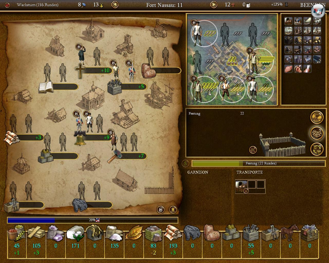 Sobald ihr eine Kolonie gründet, setzt ihr das Räderwerk in Gang, das euch Nahrung, Gold, Schätze, Rohstoffe, Produkte, Verbündete & Co einbringt. Aber wozu sind eigentlich Religions-, Handels-, Politik-, Erkundungs- und Militärpunkte gut? Nur mit ihnen könnt ihr prominente Gründerväter aus verschiedenen Bereichen in die Neue Welt locken, die euch permanente Boni gewähren: Wer sich die Dienste von Hernán Cortes sichert, bekommt in jeder Siedlung eine freie Palisade; wer Pocahontas verpflichtet, darf sich auf gute Beziehungen zu den Ureinwohnern freuen; wer Juan de Sepúlveda anheuert, bekommt gleich zwei konvertierte Indianer.