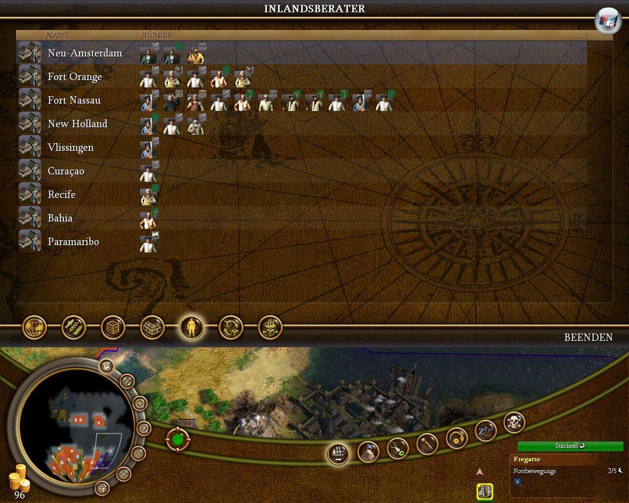 Also behandelt man jeden, wirklich jeden neuen Kolonisten, wie einen Schatz. Und man macht sich Gedanken darüber, ob man den Meistertabakpflanzer, der statt drei gleich sechs Blätter erntet, wirklich auf das Feld schickt oder ihn nicht doch zum rebellischen Politiker oder Missionar ausbildet. Das Schöne an Colonization ist, dass ihr die Berufe der Kolonisten quasi jederzeit wechseln könnt – allerdings auf Kosten etwaiger Spezialisierungen. Wie teuer die Ressource Mensch ist, vor allem wenn sie qualifiziert ist, zeigt sich bei einem Besuch im Heimatland. Wer dort seine Rohstoffe verkauft, kann auch Auswanderer mit Beruf einkaufen, wenn sie nicht von alleine in die Neue Welt wollen. Und das ist richtig teuer: Für so einen Meisterpolitiker, der im Rathaus von Québec ordentlich gegen den französischen König wettern könnte (sechs statt drei Glocken!), zahlt man schon mal zweitausend Gold. Dafür muss man in Amerika richtig lang Baumwolle pflücken.