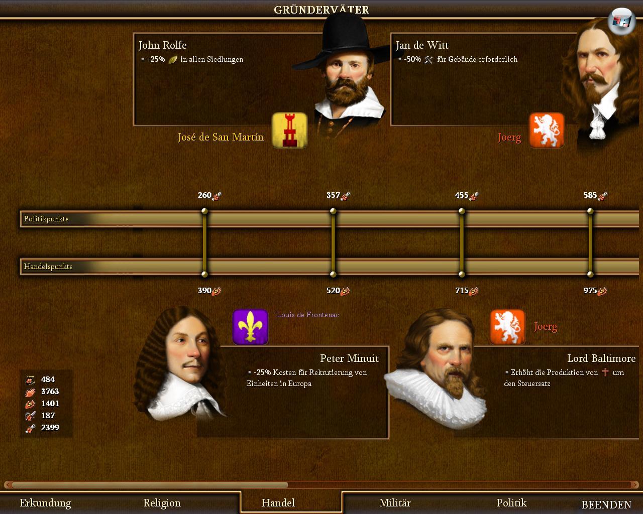 Wer geschickt Zusatzpunkte in den Bereichen Erkundung, Handel, Militär, Religion & Co sammelt, kann diese nutzen, um Gründerväter zu bezahlen, die permanente Boni einbringen.