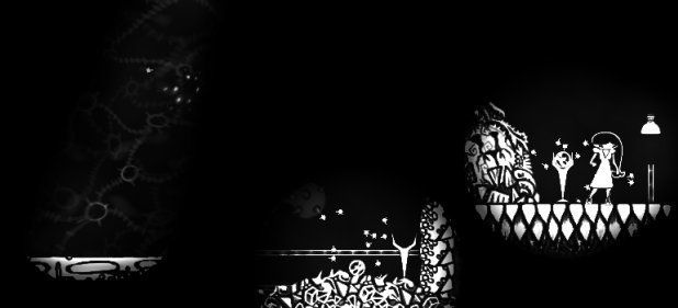 Großartig, wie das Gedankenspiel als schwarzweißer Zeichentrick Wirklichkeit wird! Krumme Strichfiguren staksen zu einem schrägen Knarzen, verwunschenen Klavieranschlägen und ein wenig Orchester. Vor dem tiefschwarzen Hintergrund flackern genau so viele Flecken, dass man die Kulisse erahnen kann – das Auge rätselt mit. Leider darf ich in diesem Mysterium keine geheimen Verstecke entdecken. Auch eine Geschichte um das sonderbare Lichtspiel, und sei sie noch so unscheinbar, fehlt komplett. Schade: Etwas Einfallsreichtum hätte der einzigartigen Spielwelt auch eine emotionale Note verleihen können.