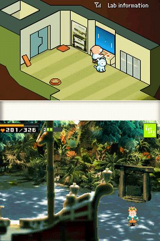 Von nun an zeigt euch der DS zwei Schauplätze: Auf dem Touchscreen dirigiert ihr Terry mittels Stylus oder Steuerkreuz über die Planetenoberfläche, sucht nach den verlorenen Schmucksteinen und kämpft gegen allerlei Monster. Auf dem oberen Bildschirm seht ihr den Professor, der in seinem Labor herumwuselt und Kommentare abgibt. Meist tippt er irgendetwas in seinen Großrechner ein oder spielt mit seinem Weltraumhund Nyan Nyan. Der sieht allerdings eher aus wie eine Katze und bewegt sich auch so. Sein Verhalten rührt daher, dass er viel lieber ein interstellarer Stubentiger wäre. Eine transspezielle Katze gefangen im Körper eines Hundes quasi. Von Zeit zu Zeit dürft ihr das putzige weiße Wesen auch selbst mit dem Stylus streicheln. Interessant am grafischen Konzept von Contact ist, dass jede Handlungsebene seinen eigenen Grafikstil besitzt. Der kauzige Wissenschaftler und sein Raumschiff sehen aus, als seien sie komplett einem 8-Bit-Titel entsprungen. Terry und die übrige Umgebung bestehen aus vorgerenderten Sprites. Der Spieler befindet sich quasi auf einer dritten Ebene, nämlich in der Realität.