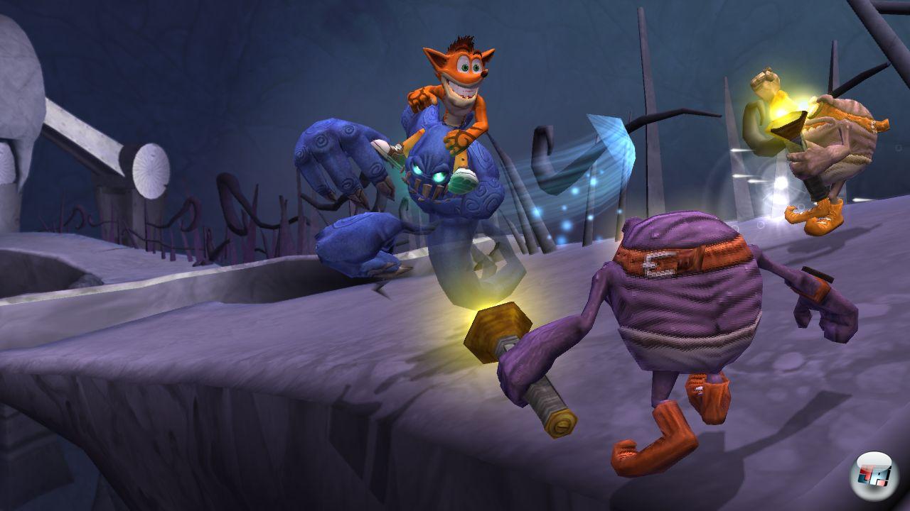 Ob alter oder neuer Titan, es warten zwei Neuerungen: Zum einen könnt ihr jetzt einen Titanen für spätere Verwendung in die Tasche packen und jederzeit daraus hervorzaubern – dann wird sein Platz automatisch mit dem Biest getauscht, auf dem Crash gerade herumreitet. Zum anderen haben die Titanen jetzt eine eigene von Crash unabhängige Lebensenergie-Leiste sowie ein ganz privates Mojo-Konto: Mojo ist das silberne Zeug, das ihr aus jedem Gegner herausprügeln könnt. Sammelt ihr das ein, wird eure Mojo-Leiste aufgefüllt, die an bestimmen Punkten automatisch Eigenschaften wie Schlagkraft oder Rotationsgeschwindigkeit verbessert. Allerdings hängt das Upgrade vom gegenwärtigen Reittier ab: Ist Crash auf seinen eigenen Füßen unterwegs, kassiert er das Mojo – sitzt er einem Titanen im Nacken, gehen die Klunker auf sein Konto.