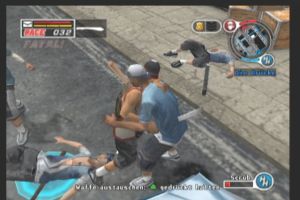 So prügelt und ballert ihr euch gelangweilt durch die Straßen der fiktiven Großstadt, führt mehr oder weniger plumpe Aufträge aus und klettert von albernen Story-Fetzen begleitet in der Beliebtheitsskala der Outlawz langsam nach oben, wodurch ihr auf euren Steifzügen von immer mehr Homies begleitet werdet, denen ihr sogar eine Hand voll Befehle wie „Greift an!“, „Haltet euch zurück!“ oder „Helft mir!“ erteilen könnt. Leider könnt ihr ihnen jedoch nicht sagen, wie sie eine zuvor erklommene Treppe wieder hinab kommen, wenn sie mal wieder in irgendwelchen Hinterhöfen verhängen und zu blöd sind, euch zu folgen… Na ja, wenigstens sind sie unsterblich und trotten euch sogar noch mit völlig entleerter Lebensenergie brav bis zum nächsten Energie spendenden Junk Food-Tempel hinterher.