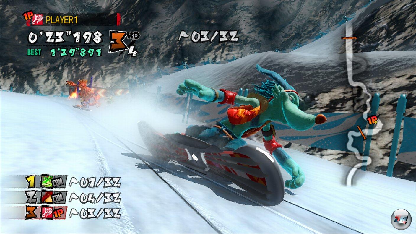 Auf visueller Ebene macht das Spiel weniger falsch: Die Framerate liegt zwar deutlich unter 60 Bildern pro Sekunde, der Wintersport läuft aber stets flüssig über den Schirm. Außerdem bietet der Schnee viel mehr flauschige, realistisch in der Sonne glänzende Knubbel als in Sonic Free Riders. Die Skate-Biester wurden zwar etwas zu übertrieben auf cool getrimmt, doch ihr fein strukturiertes, sanft beleuchtetes Fell kann sich sehen lassen. Wem das Design nicht gefällt, darf auch mit seinem Avatar über die Piste pflügen. Lediglich ein paar grobe Clipping- und Physik-Schnitzer trüben das ansehnliche Gesamtbild: So kann ich z.B. direkt durch Slalomtore fahren, ohne dass diese sich bewegen. Die Musikuntermalung besteht durchweg aus rocklastigen Stücken. Statt bekannter Lizenz-Titel gibt es meist kerniges Instrumental-Geschrabbel zu hören. Der überdrehte Kommentator fällt dagegen in die Kategorie akustische Lärmbelästigung. Selbst wenn ich mich richtig dumm anstelle, himmelt er mich penetranter an als jedes Boyband-Groupie.