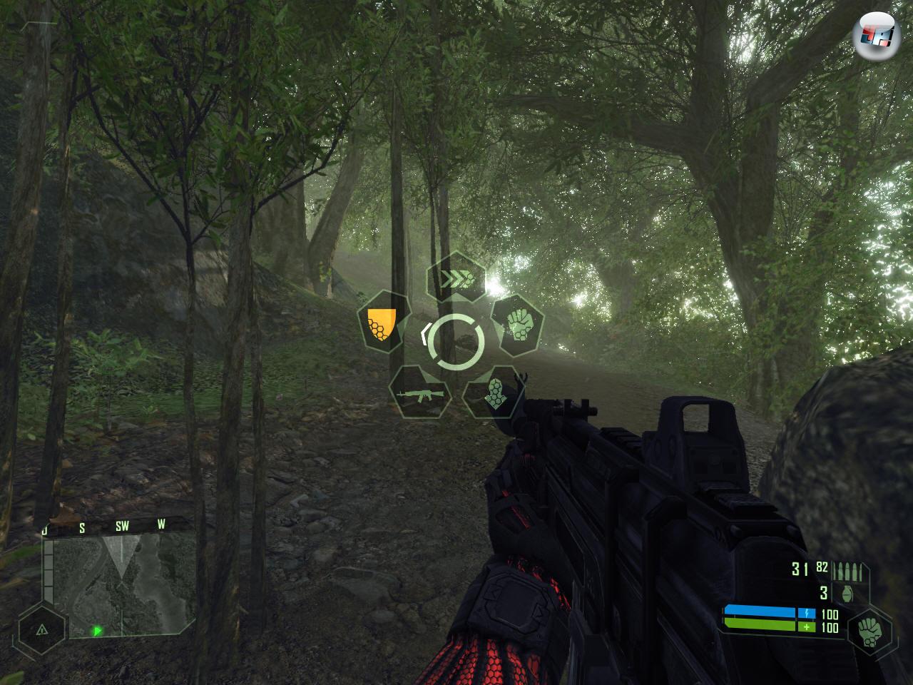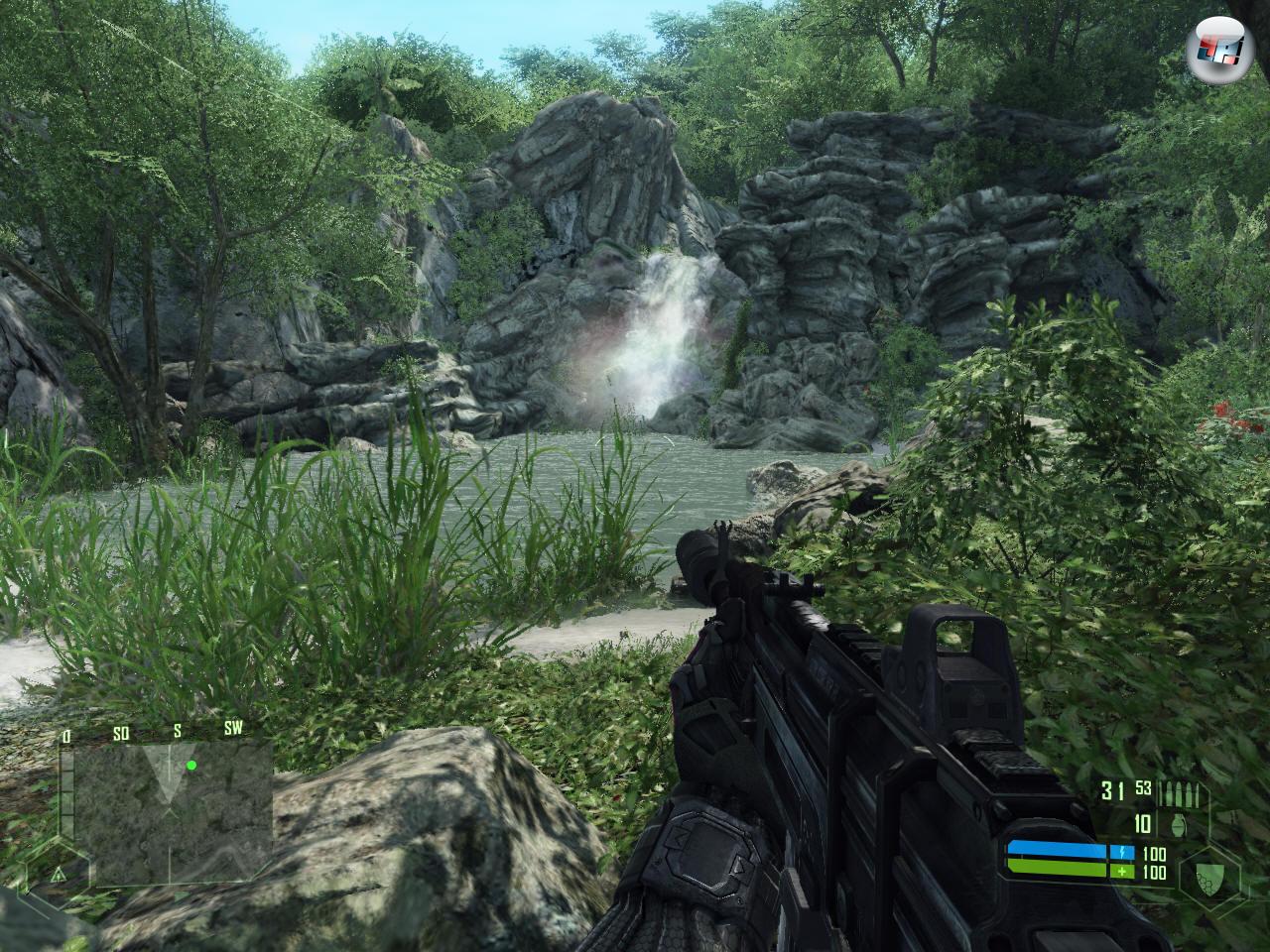 Genau genommen dürfte der erste Gedanke während der ausufernd langen Installation etwas in der Art von »Muss ich für mehrere Wochen auf Essen verzichten, um meinen Rechner aufzurüsten?« sein. Denn von Crytek erwartet man nicht weniger als den gegenwärtig bestaussehendsten Shooter. Habt ihr ein Quadcore-SLI-Schlagmichtot-Monster mit möglichst viel RAM zu Hause stehen, dann bekommt ihr den auch: Der Dschungel ist dicht, der Dschungel ist bewaldet, der Dschungel ist so dschungelig, wie es auf einem Computer derzeit machbar ist! Schmetterlinge und Blätter schwirren umher, Gras und Bäume schwanken im Wind und bei Berührung, Buschwerk verbiegt sich beim Durchlaufen, Sonnenstrahlen kitzeln durch dichte