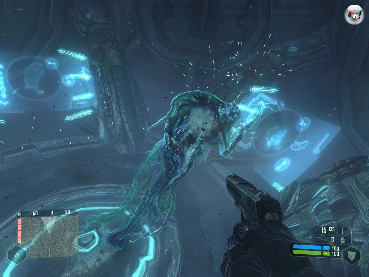 Nicht nur spielerisch, auch erzählerisch folgt Crysis seinem Vorgänger relativ dicht: Ihr beginnt in einer Bilderbuchlandschaft, trefft eine klugschwätzende Frau und erkundet etwa ab der Spielhälfte vermehrt Höhlen – in denen dann auch bizarre Viecher (hier: Kaulquappen-Außerirdische) lauern. Gegen Ende werden aus den lauschigen Romantiktreffpunkten dann eisbedeckte Polarkappen, in denen der Atem sichtbar wird und das Anzugsdisplay immer wieder gefriert – cool! Ebenso cool, zumindest als Idee, ist der Ausflug in die Schwerelosigkeit: Das Schweben durch die fremdartigen Alien-Gänge ist anfangs faszinierend, kurz darauf unübersichtlich und nach unnötig langer Zeit durch vermehrte Gegnerattacken, die man mangels Munition hauptsächlich