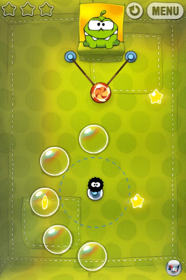 Schon wieder eines von -diesen- Spielen, die einen problemlos bei der Stange halten, unabhängig davon, wie oft man schon »Okay, aber nur noch einen Level, ich muss echt ins Bett, verdammt!« gemurmelt hat. Und wie bei diesen Zeitfressern üblich, ist das Spielprinzip kindisch einfach: Eine realistische Physikengine sorgt dafür, dass Om Noms begehrter Süßkram an dünnen Fäden herumbaumelt – anfangs noch einer, später werden es deutlich mehr. Man muss diese Fäden in der richtigen Reihenfolge und zum richtigen Zeitpunkt der Fingerwischer durchtrennen, dann fällt das Bonbon in Om Noms weit aufgerissenes Maul, er freut sich diebisch, auf geht’s ins nächste Level. Klingt einfach? Ist es auch, aber seinen Reiz bezieht Cut The Rope aus zwei Dingen: Erstens werden die Levels und Fadenkonstrukte mit steigender Zahl immer komplexer – aber nicht komplizierter. Zwar kommen weitere Spielelemente hinzu, die grundsätzliche Formel bleibt aber 100 Levels lang (weitere sollen folgen) unangetastet.