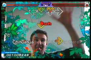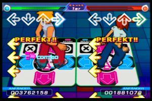 | Anschauungsunterricht: Beim Schwierigkeitsgrad „Anfänger“ wird stets die korrekte Tanzmattennutzung als Hilfe eingeblendet. |