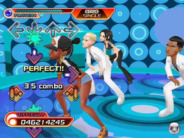 Ähnlich wie in anderen Musikspielen ála Guitar Hero gilt es, passend zum Takt bestimmte Symbole zu treffen – mit dem Unterschied, dass ihr hier nicht Knöpfe drückt, sondern mit euren Füßen auf der erneut hervorragend verarbeiteten Tanzmatte herumhüpft, die ihr mit dem GameCube-Stecker an die Konsole anschließt. Klar, dass das wesentlich anstrengender ist als der normale Zockeralltag und jedem Faulpelz vermutlich nur ein müdes Gähnen samt einem „Nein, danke“ entlocken wird. Denn schon auf dem normalen der vier Schwierigkeitsgrade tropft bereits nach ein paar Tanzrunden der erste Schweiß auf den Boden – von den höheren Stufen will ich erst gar anfangen, denn hier muss man wirklich schon extrem fit und schnell sein, um die irren Bewegungsabfolgen zu meistern. Hinzu kommt, dass es neben den normalen Pfeil-Symbolen auch noch Extras wie den Fußstampfer gibt, dem auch „Überraschungspfeile“ folgen können. Fies sind auch die Minen, die sich immer wieder zwischen den Pfeilen einschleichen und explodieren, wenn ihr im falschen Moment auf dem falschen Feld steht. Im Gegensatz zur Xbox 360-Tanzmatte für Dacing Stage Universe hat das Wii-Pendant übrigens weniger dieser Panels. Als Ausgleich dürft ihr hier zusätzlich noch Remote und Nunchuk in den Spielablauf integrieren, was auch super funktioniert. Dabei müsst ihr ähnlich dem Bandspiel aus Rayman Raving Rabbids 2 den rechten und / oder linken Controller nur kurz schütteln, sobald das Symbol auf dem Bildschirm erscheint. Anspruchsvollere Motion-Manöver, wie sie euch bei