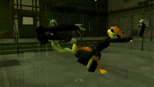 Reine Solo-Minispiele erledigt ihr im Hauptquartier, wo sich Daxter schlafen legt und im Traum als Neo, Indy oder William Wallace („Freiheiiiiit!“) glänzt. In den Parodien erwarten euch einfache Reaktionstest, deren Bestehen das Frettchen mit witzigen Filmzitaten quittiert. Ähnliche Einlagen erledigt ihr auch während der Missionen, wenn ihr Dampfmaschinen steuern oder elektronische Systeme knacken müsst. Einen nervenden Kumpel bekommt Daxter übrigens ebenfalls spendiert – freut euch auf einen ungewöhnlichen, piepsigen Kameraden… Abgesehen davon erreicht Ready At Dawn aber nie die Ideenvielfalt von z.B. Rare: Verschiedene Schläge, Springen, Schießen und Fliegen reichen dem fluffigen Helden zur Problemlösung und auch die Handlung erfindet den Spannungsbogen nicht neu. Zudem wird die Jagd nach Ungeziefer-Jagd mit witzigen Einlagen versüßt, so dass Daxter u.a. von Trampolins abspringt, wie eine Rakete in die Luft zischt und anschließend mit einem ungelenken Bauchklatscher auf den Boden plumpst.