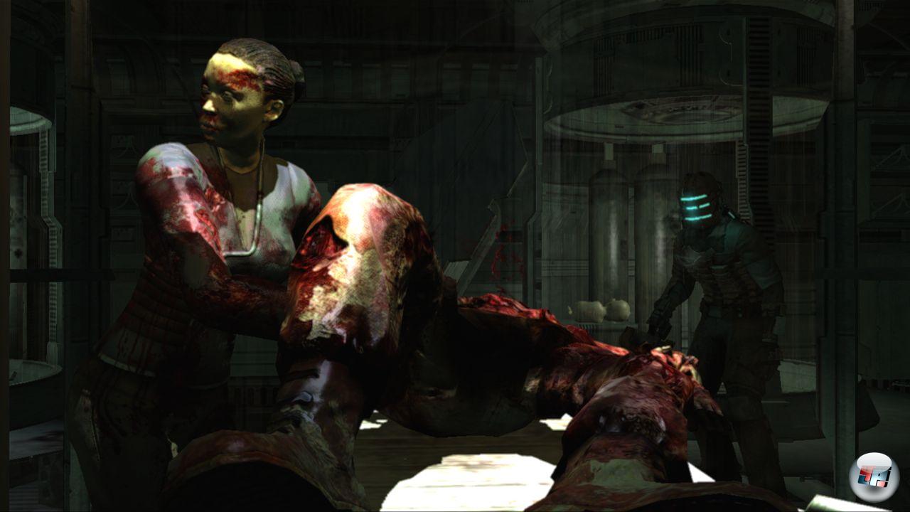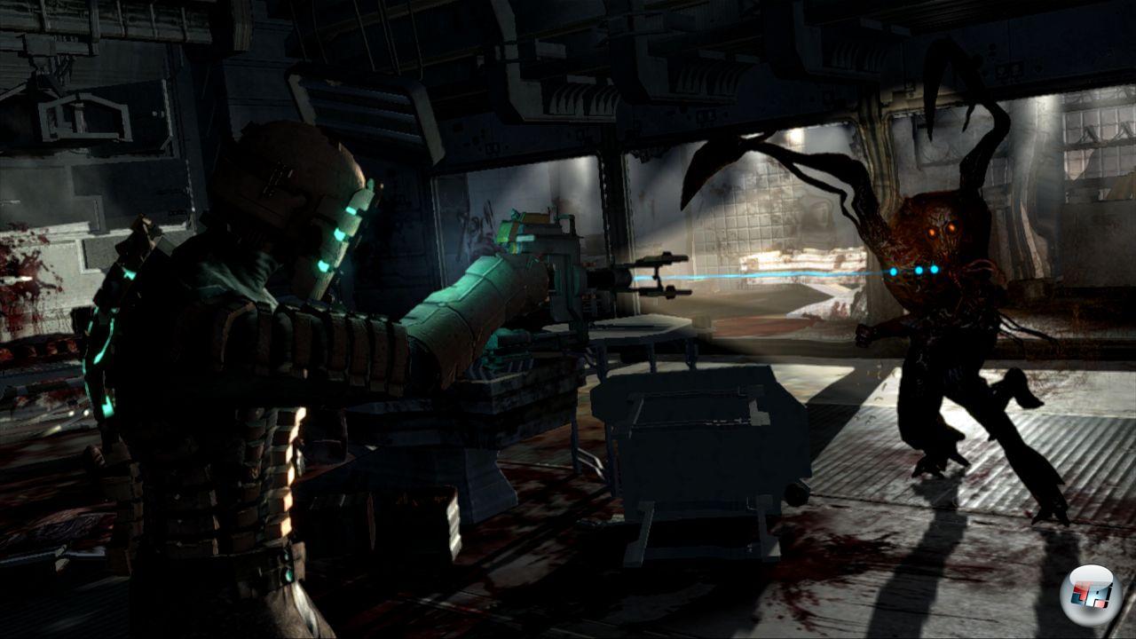 Gut gelungen ist hingegen der Einsatz von Vakuum und Schwerelosigkeit. Wer jetzt chaotische Jetpack-Fliegereien befürchtet, kann aufatmen: Dank Schwerkraftstiefel bleibt Isaac auch in Räumen mit deaktiviertem Gravitationsfeld bodenständig, kann sich aber durch gezielte Schubstöße auch problemlos von Wand zu Wand oder an die Decke bewegen, die dann jeweils zum neuen Boden werden, da die Kamera stets über eure Schulter blickt. Die Orientierung bleibt dadurch so gut es geht gewährleistet und versprüht ein wenig Spider-Man-Flair, nur dass nicht verankerte Objekte, Leichen und selbst Bluttropfen hier beeindruckend im Raum schweben und abrupt zu Boden fallen, wenn die Schwerkraft wieder hergestellt wird. Dass ihr in diesen Abschnitten nur auf kriechende bzw. krabbelnde Gegner trefft, die auch sonst der Schwerkraft trotzen, ist nur konsequent, auch wenn diese durch ihre ungebremste Sprungkraft sehr mobil sein können.