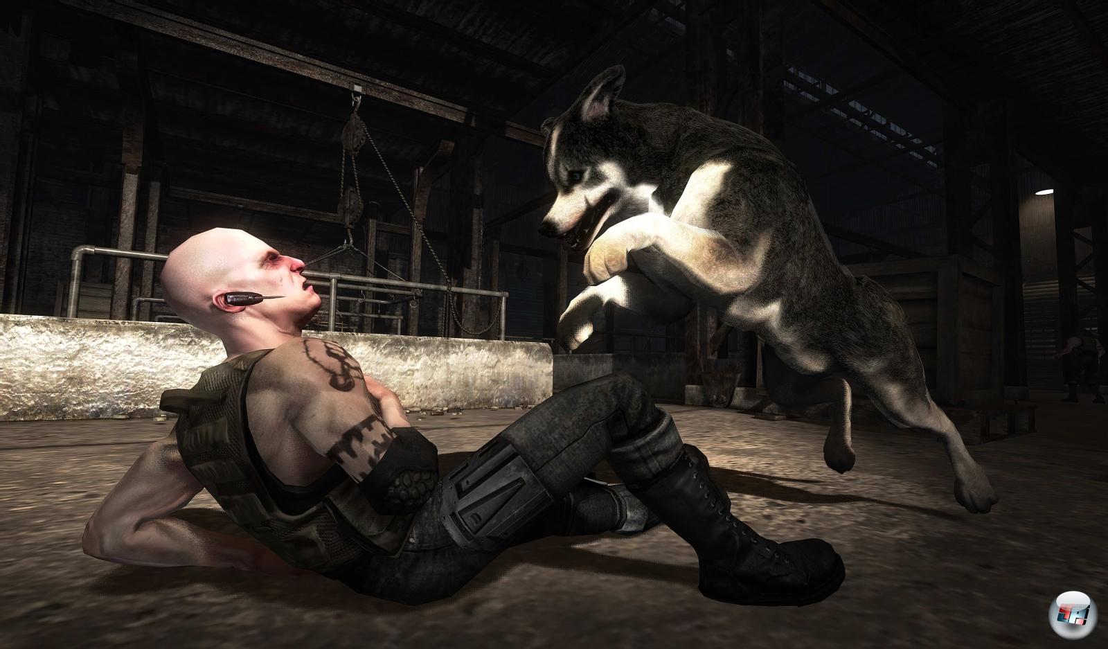 Denn ist man mit dem für mein Empfinden überdimensional groß geratenen Husky-Mischling Shadow unterwegs, wechselt nicht nur die Farbgebung, um das Sehspektrum des Vierbeiners zu kennzeichnen. Auch die Spielmechanik geht einen etwas anderen Weg: Wo Jack in erster Linie auf schlagfertige oder bleihaltige Argumente setzt, macht Shadow meist den Fisher (also den Sam von damals, den, der noch nicht versuchte, Jack Bauer oder John McClane zu sein). Natürlich kann man auch mit dem blauäugigen Rachehund wie eine vierpfotige Furie durch die Abschnitte rauschen und den Gegnern an die Gurgel oder sonstige Körperteile gehen, bei denen Mann schon beim bloßen Gedanken schmerzverzerrt das Gesicht verzieht. Da Shadow aber bei weitem nicht so resistent gegen Schläge oder Kugeln ist wie Jack und vor allem gegen die schwer gepanzerten Feinde der zweiten Spielhälfte bei direkter Konfrontation kaum eine Chance hat, sollte man auf die Frontalattacke nur als letztes Mittel zurückgreifen.