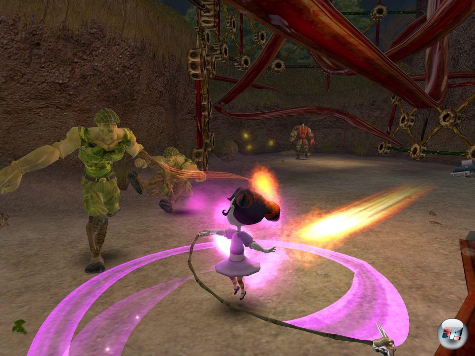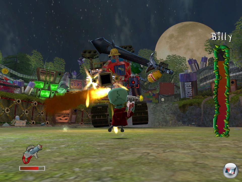 Das lag u.a. daran, dass Dutzende Gegner auf DJ und Pandora einstürmen, aber keiner von ihnen ein Eigenleben entwickeln konnte. Die Fieslinge sagen nichts, tun nichts – sie stürzen sich nur wortlos auf die Helden oder schmeißen explosives Geschoss nach ihnen. Auch wenn die großartige Protagonisten-Bande, u.a. ein toter Guppy mit dem Namen… Toter Guppy, zu Wort kommt, zünden die Gags zu selten. Es lag auch an den Kulissen, die in der nahen Zukunft vielleicht mal eine herrlich schräge Hommage an Tim Burton sein werden – sobald sie nicht mehr als austauschbare geradlinige Levelschläuche missbraucht werden. Selbst die Musik zitiert zwar vertraute Versatzstücke des Horrorgenres – verpasst ihnen aber nie die bemühte eigenständige Beschwingtheit. Und nicht zuletzt lag es vor allem am drögen Gegner-Vermöbeln, dass Root of Evil auf Dauer ermüdend war. Euer gewählter Held haute sich zwar flott und unkompliziert durch Monster, Untote und was sonst noch aus Albträumen entfleucht schien. Auf Höhepunkte wie mächtige Kombos oder besonders coole Attacken musste er aber verzichten. Nur beim flotten Ballern in der Ego-Ansicht kam der Ausflug halbwegs in Schwung – so lange die bockige Kamera das Geschehen zeigen wollte…