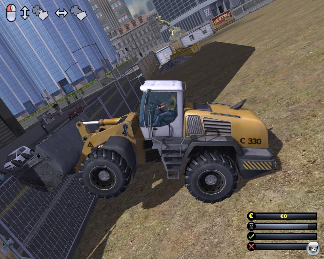 Stimmt. Wer den Landwirtschaftssimulator mag, wird auch die Demolition Company mögen. Handwerklich ist das, was einem hier geboten wird, zumindest mal solide. Die Außenwelt ist an einigen Stellen sogar durchaus glaubwürdig dargestellt…fürchterlich steril, aber doch einigermaßen authentisch. Die Fahrzeuge verfügen zwar nicht über Originallizenzen, sind aber ansehnlich ihren realen Vorbildern nachempfunden und können mit verschiedenen Kameraperspektiven aufwarten, wobei die Cockpitansicht die überzeugende ist und sich durchaus sehen lassen kann. Gleiches gilt für den Sound- vorausgesetzt man kann dem sonoren Dröhnen eines 500 PS Ungetüms etwas abgewinnen. Alles in allem machen die Entwickler nicht viel schlechter als beim LWS (weniger Wirtschaftssimulation), ein paar Dinge besser (Physik und Optik) und auf jeden Fall eine ganze Menge besser als ihre Vorgänger beim „Spreng- und Abriss-Simulator“.