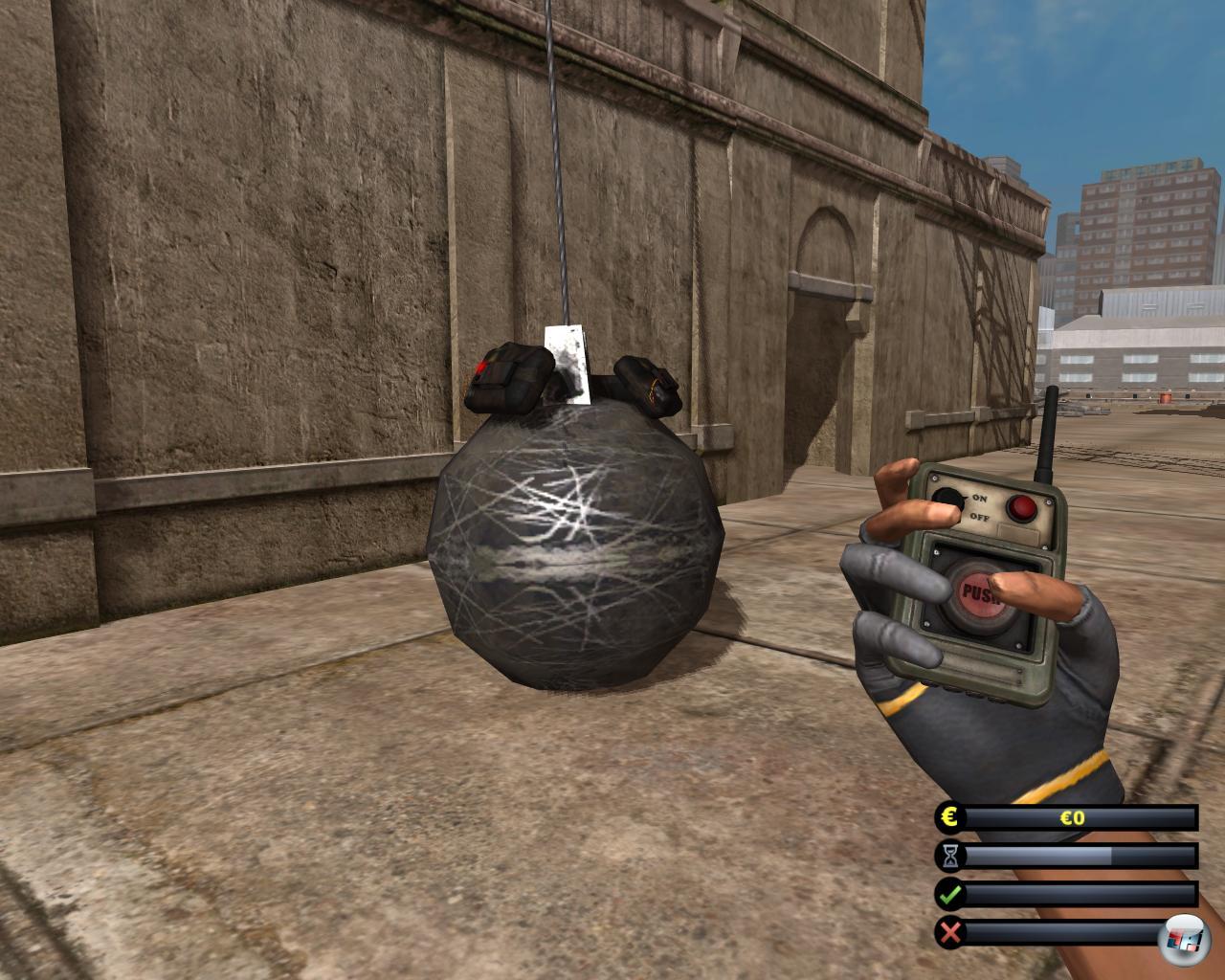 In den folgenden Aufträgen kommen nach und nach sämtliche Gerätschaften zum Einsatz, denn ich verdiene schließlich mit jedem Auftrag gutes Geld um meinen Fuhrpark zu erweitern. Insgesamt sieben Fahrzeuge, vier Handwerkzeuge und drei Arten von Sprengstoff lerne ich in den insgesamt 24 Einsätzen kennen. Das Problem ist nur: Von den 24 Aufträgen ähnelt sich etwa die Hälfte sehr. Zwar gibt es mit Bahnhof, Hafen, Industriegebiet, Innen- und Altstadt fünf verschieden Szenarien, so dass ich mal einen Schornstein einer Fabrik sprenge und dann mal einen alten Turm am Bahnhof, doch im Grunde handelt es sich ja um denselben Job. Die Folge: Langeweile…schon wieder! Wie auch beim LWS so kriecht sie auch hier unweigerlich irgendwann aus der virtuellen Baugrube über Pad/Tatstatur in den Kopf und macht sich dort breit wie ein Geschwür. Warum wieder so eine seelenlose Spielwelt ohne Menschen, Tiere und ohne ein Alter Ego dem ich zumindest mal einen Namen geben darf, was ja irgendwie identitätsstiftenden Charakter hätte? Einen zumindest angedeuteter Wirtschaftsteil mit konkurrierenden Unternehmen sollte man eigentlich auch erwarten dürfen und last but not least eine wirklich funktionierende Spielphysik. Zwar übertrifft sie jene des miserablen “ Spreng- und Abriss-Simulator“ um Längen, aber auch hier geht es mal wieder nicht ohne Aussetzer die bestenfalls zu unfreiwillig komischen Szenen führen, schlimmstenfalls zu Aufregern. Da kippt ein tonnenschwerer Radlader schonmal um, weil man eine Mulde „ungünstig“ touchiert (lustig), aber wenn dicke Betonplatten aus der Baggerschaufel hüpfen wie Flummis, nur weil man den Neigungswinkel leicht verändert um den Kipper zu treffen, dann nervt das tierisch.