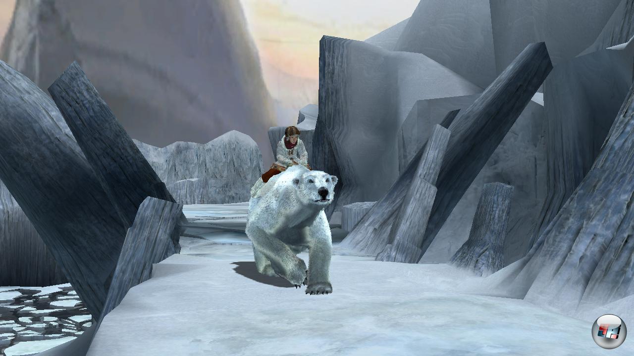 Wer Buch- und Filmvorlage nicht kennt, wird allerdings viele Zusammenhänge überhaupt nicht verstehen, da teils entscheidende Szenen fehlen und sich ständig inhaltliche Lücken auftun. Zudem wirken die Filmschnipsel trotz meist nahtloser Übergänge wie Fremdkörper. Das liegt vermutlich daran, dass die grafische Präsentation äußerst bescheiden ist und die Figuren den Schauspielern teils alles andere als ähnlich sehen. Aber sei’s drum, irgendwann hat man sich selbst an das dilettantisch modellierte und holprig animierte Lyra-Double gewöhnt, mit dem man einen Großteil des Spiels unterwegs ist. Des Weiteren schlüpft ihr auch in die Rolle des gepanzerten Eisbären Iorek sowie Lyras Dämonenbegleiter Pan, den ihr allerdings nur bei einer Reihe von Quick-Timer-Events selbst steuern dürft.