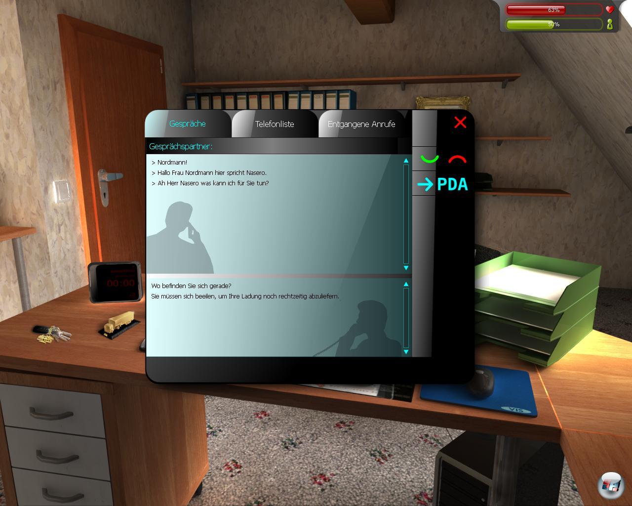 Wer dann frisches Blut braucht, kann sich das vom guten alten Arbeitsamt holen. Auch hier scheinen die Macher nicht gemerkt zu haben, dass das jetzt die Bundesagentur schmeißt. Wer hier einen Fahrer, Disponenten oder Buchhalter sucht, muss aber endlich mal verhandeln. Auf Anfrage bekommt man eine Bewerbung geschickt und kann den potenziellen Arbeitnehmer anrufen. Dann gilt es, die Gehaltswünsche des Gegenübers zu treffen, was leider recht simpel ist. Die Fahrer, die man von Anfang an im Team hat, sind übrigens im Spiel viel schlechter, da sie angeblich weniger arbeitsam sind und dazu mehr Geld verdienen. Also heißt es: schnell auswechseln. Bis auf Einstellung und Spezialausbildung erfährt man übrigens nichts von den Leuten, so dass sie bloße Nummern in der Statistik bleiben.