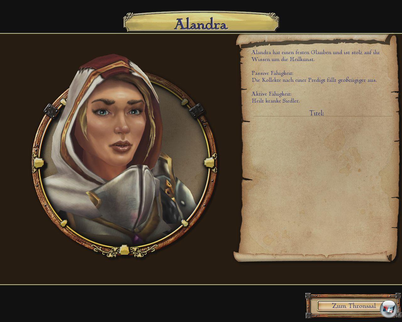 Insgesamt gibt es sechs Anführer, die als einfache Ritter starten und sieben Ränge aufsteigen können. Jeder verfügt über eine passive und aktive Spezialfähigkeit. Unter Alandra spenden die Leute eifriger und sie kann kranke Siedler heilen.