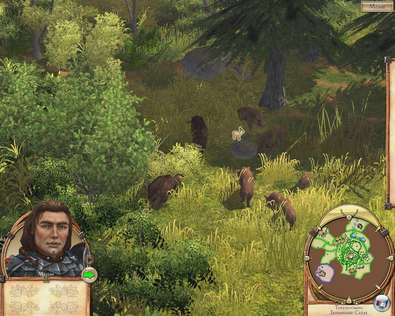 Zunächst werden allerdings beide Parteien verwöhnt. Schon der erste Blick in diese mittelalterliche Welt ist ein zauberhafter: Prächtige Städte mit Fachwerk, bunten Schildern und geschäftigen Leuten. Nur erinnern die weniger an die putzigen Siedlerfigürchen der Anfangszeit als vielmehr realistisch angehauchte Liliputaner aus Gullivers Reisen – vor allem die Helden mit ihren viel zu großen Köpfen. Aber man gewöhnt sich an diesen Stil und er hat auch seine Berechtigung: Schließlich geht es nicht nur um knuffiges Häusle bauen, sondern auch ums nackte Überleben – witzige Animationen inklusive. Wenn man mit der Kamera auf Entdeckungsreise geht, wird man neben grasenden Rehen und hoppelnden Hasen auch streunende Wolfsrudel oder vor sich hin brummende Braunbären finden. Vorsicht: Die greifen an! Der Held muss gerade bei den ersten Ausritten auf der Hut sein. Die Lands chaft begeistert gerade noch mit ihren satten Herbsttönen und goldenen Feldern, irgendwann rieseln dann die ersten Schneeflocken hinab und tauchen alles in ein flockiges Weiß. Und das Vereisen der Flüsse sieht einfach fantastisch aus…