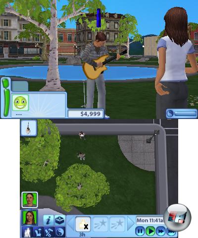 Macht aber nichts – so ein Simleben ist auch mit weniger noch mehr als die meisten Rollenspiele und daran ändert selbst die inhaltlich schmerzlich gekürzte 3DS-Version nichts. Nützt es denn, dass man das Flirten, das Zetern, das Schwitzen, das Verzweifeln – das ganze bunte Treiben eben – in Nintendos Pantoffelbühne betrachten kann? Nein, leider nicht. Natürlich hat es seinen Reiz, das dreidimensionale Bild zu sehen. Zum einen gehört die ohnehin träge Darstellung allerdings nicht zu den malerischen und zum anderen gibt es die Mittendrin-Perspektive ausschließlich auf dem oberen Bildschirm; die Steuerung erfolgt hingegen auf dem unteren Bild – aus der Vogelperspektive.