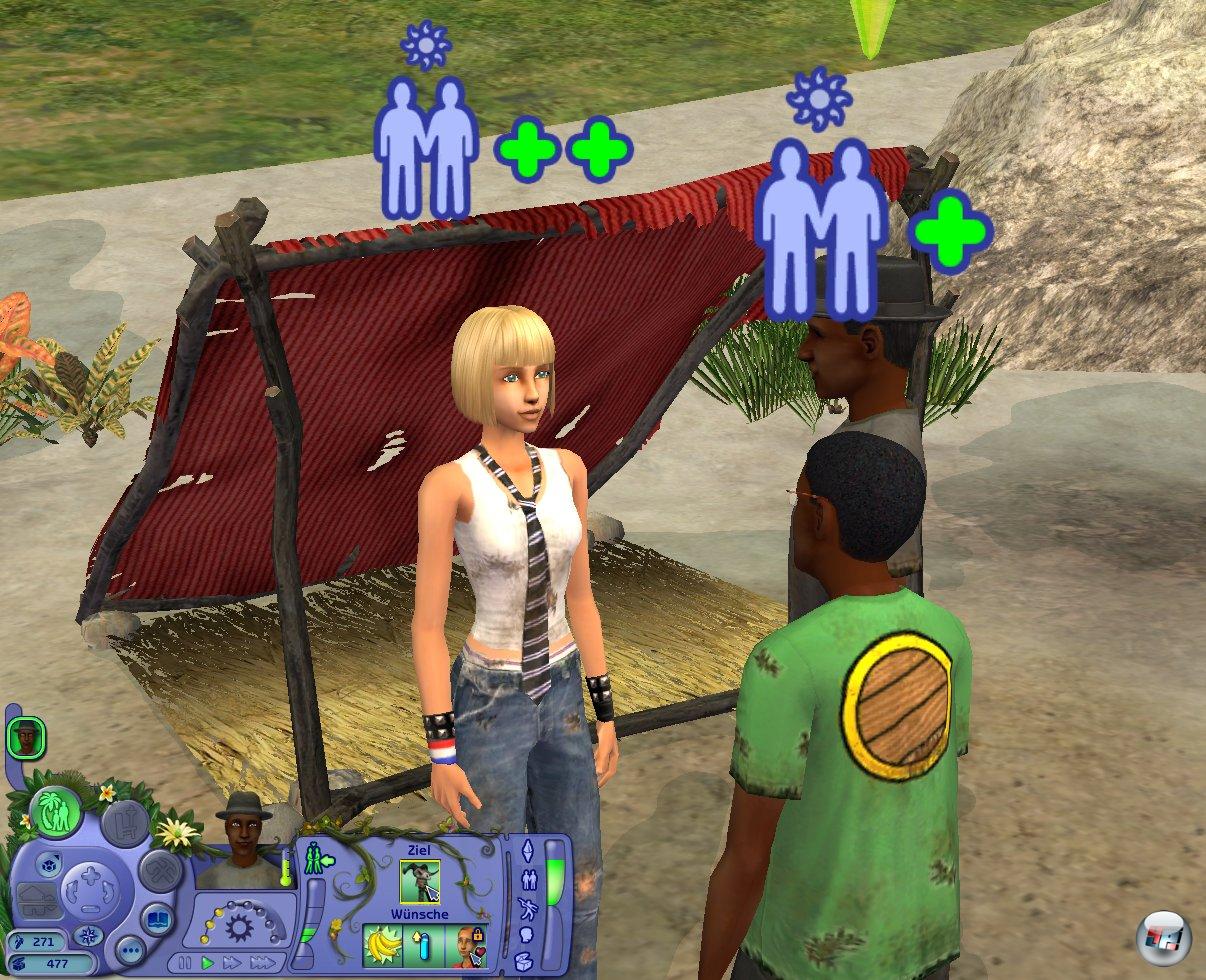 Neben dem momentanen Hauptziel werden auf dem Bildschirm drei wechselnde Vorgaben eingeblendet, die eurem Sim Lebensqualität verschaffen. Sobald ihr andere Schiffbrüchige von der Kreuzfahrt getroffen habt, kann solch eine Zusatz-Aufgabe z. B. das Flirten sein. Die simplen und bis ins Detail erklärten Hauptziele der Geschichte sind leicht erledigt, doch das Aufbauen von Freundschaften und Beziehungen gestaltet sich deutlich anspruchsvoller. Statt einfach eine bestimmte Aufgabe zu erfüllen, müsst ihr euer Feingefühl beweisen. Geht mit eurer Flamme schwimmen, erzählt ihr Witze und plaudert und flirtet mit ihr, um sie fröhlich zu stimmen. Auch selbst gebaute Sofas sind bei Schiffbrüchigen auf Partnersuche sehr beliebt. Je nachdem, welche Eigenschaften ihr eurem Schützling zu Beginn des Spiels zuordnet, fühlt er sich z.B. als Familienmensch oder aber mit möglichst vielen Affären glücklich.