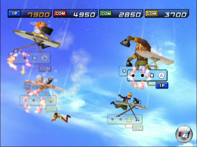 Also jeder ein Brett, Bügeleisen und einen Stapel Wäsche geschnappt, raus aus dem Flugzeug und im freien Fall schön brav den Anweisungen des Bügelmeisters folgen. Wer einschlägige Tanzspielerfahrungen hat, weiß ungefähr was ihn erwartet: Einfach im richtigen Moment vorgegebene Bewegungsmuster nachahmen. Trotz wechselnder Positionen und teils vom Bildschirmrand verschluckter Bügelanzeigen, ein eher simples Unterfangen. Man schwingt die Remote nach vorn, zur Seite oder diagonal, lässt per Knopfdruck Dampf ab und rubbelt gelegentlich um die Wette, um in einer kurzen Solo-Einlage den anderen sein Können vorzuführen, bis die Reißleine gezogen wird. Eher was für unausgelastete Hausfrauen oder -männer…