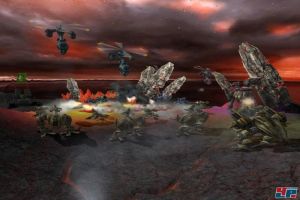 Immer noch gibt es lediglich zwei Kriegsparteien, die sich jetzt wenigstens leicht unterscheiden – vor allem die Spezialeinheiten sorgen für Abwechslung in der Monotonie der konventionellen Truppen. Es gibt z.B. riesige Mechs, die mit zwei Waffensystemen ausgestattet sind, so dass man seine Raketen auf den einen und die MG-Salve auf den anderen Gegner feuern kann. Hinzu kommen mächtige Geschütztürme, die man ideal als Block setzen kann sowie nützliche Land-, See- und Flug-Transporter. Auch einige tödliche Kombinationen sind möglich: Wer z.B. eine Artillerie auf einer schwimmenden Kampfplattform positioniert, verbindet maritime Beweglichkeit mit großer Raketenreichweite. Dazu noch ein Flugzeugträger mit bis zu vier Bombern sowie ein Zerstörer und die mobile Flotte kann ganze Territorien in Schutt und Asche legen. Besonders ansehnlich ist der Schild gegen Luftangriffe: Ihr könnt defensive Fahrzeuge kaufen, die à la Perimeter <a class="DYNLINK" onmouseover="DynToolTipp_Show('Klicken für Gameinfos‚)“ onmouseout=“DynToolTipp_Hide(); “ href=“javascript:DynCont_Display(‚Gamefinder‘,’runmod.php?sid=%7BSID%7D&LAYOUT=dyncont_gf&spielid=1879′)“> umgehend einen Bereich mit einem blau leuchtenden Schutzschirm umhüllen – Bomber haben da keine Chance mehr.