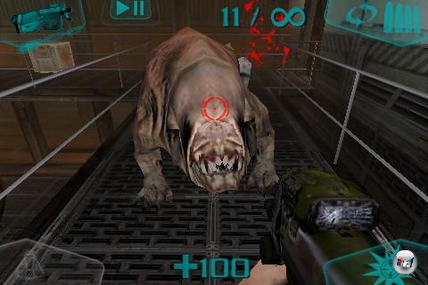 Aber ausgewichen wird nur selten, die meiste Zeit spricht der Feuerknopf: Drückt man auf den rechten unteren Rand des Touchscreens, wird drauflos geballert, bis der Gegner röchelnd zu Boden geht und sich kurz darauf in kleine Funken auflöst. Ob Pinky Demon, Hellknight, Imp, Lost Soul, oder diverse Standard-Zombies – ein bemerkenswert großer Teil des Doom 3-Feindeskaders hat den Sprung auf den iPod geschafft. Je nach Waffe gehen die Widersacher schneller oder langsamer zu Boden, manche gehen sogar in den Nahkampf: Wird man gepackt, muss man das Gerät schnell schütteln, um den Gegner abzuwehren. Ein dezentes Autotargeting vereinfacht das Marine-Leben, ebenso wie die automatisch angelegten, großzügig verteilten Checkpunkte, was gerade auf den höheren der vier Schwierigkeitsgrade sehr hilfreich ist. Zwar erreicht Doom Resurrection nie das fiese Niveau des großen Bruders, ist aber dennoch herausfordernd.