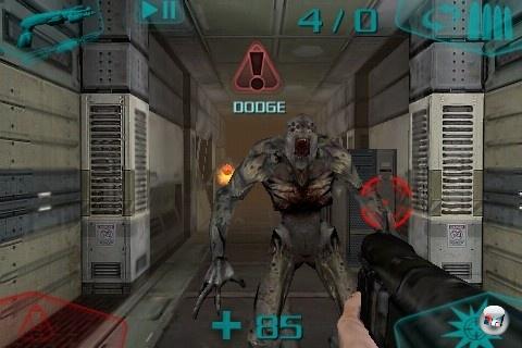 : Hauptmenümusik, Leveldesign, Soundeffekte, Gegner, generelles Szenario – ein Spin-Off, wie es im Buche steht. In einem wichtigen Punkt scheiden sich aber die Wege der beiden: dem Spieldesign! Denn während Doom 3 ein klassischer WASD-Egoshooter ist, erwartet einen auf dem iPhone ein Railshooter sehr houseofthedeadiger Machart. Die Bewegungen der Spielfigur erfolgen automatisch, man selbst hat keinen Einfluss auf die Lauf- oder Sichtrichtung. Stattdessen kontrolliert man das frei im Bild schwebende Fadenkreuz, indem man das Gerät herumkippt – zum Spielstart wird automatisch kalibriert. Außerdem kann man, falls man seine Position verändert haben sollte, jederzeit manuell nachjustieren, was wunderbar unkompliziert funktioniert. Die Fadenkreuz-Kontrolle bedarf Gewöhnung, da sie relativ träge funktioniert – das ist aber auch sinnvoll, denn zu schnelle Bewegungen würden nicht zum eher gemütlichen Spielablauf passen. Für Hektik wird trotzdem gesorgt: Entweder durch halbversteckte Items, die man sich schnell schnappen muss, bevor die Spielfigur ihren Blick wegdreht. Oder durch Reaktionstests bei Gegnern, deren Geschossen man auf Knopfdruck ausweichen muss.