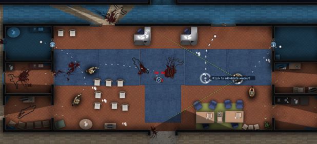 Door Kickers inszeniert eine Mischung aus dynamischer Echtzeit-Taktik à la Frozen Synapse und SWAT 2 aus der Vogelperspektive. Ich kommandiere ein Team aus schwer bewaffneten Spezialeinsatzkräften, die robust gegen Terroristen, Drogendealer, Geiselnehmer oder sonstige bösen Buben vorgehen. Die in Echtzeit ablaufenden Einsätze kann man jederzeit mit einem Druck auf die Leertaste pausieren und komfortabel neue Befehle verteilen. Der Clou: ähnlich wie in Monaco werden mir nur die Sichtlinien meiner Beamten farbig angezeigt. Der Rest liegt im blau hinterlegten Sichtschatten und kann bleihaltige Überraschungen bereithalten, die schnell zum dauerhaften Ableben meiner Einsatzkräfte führen können.