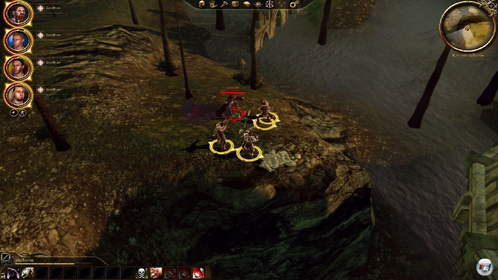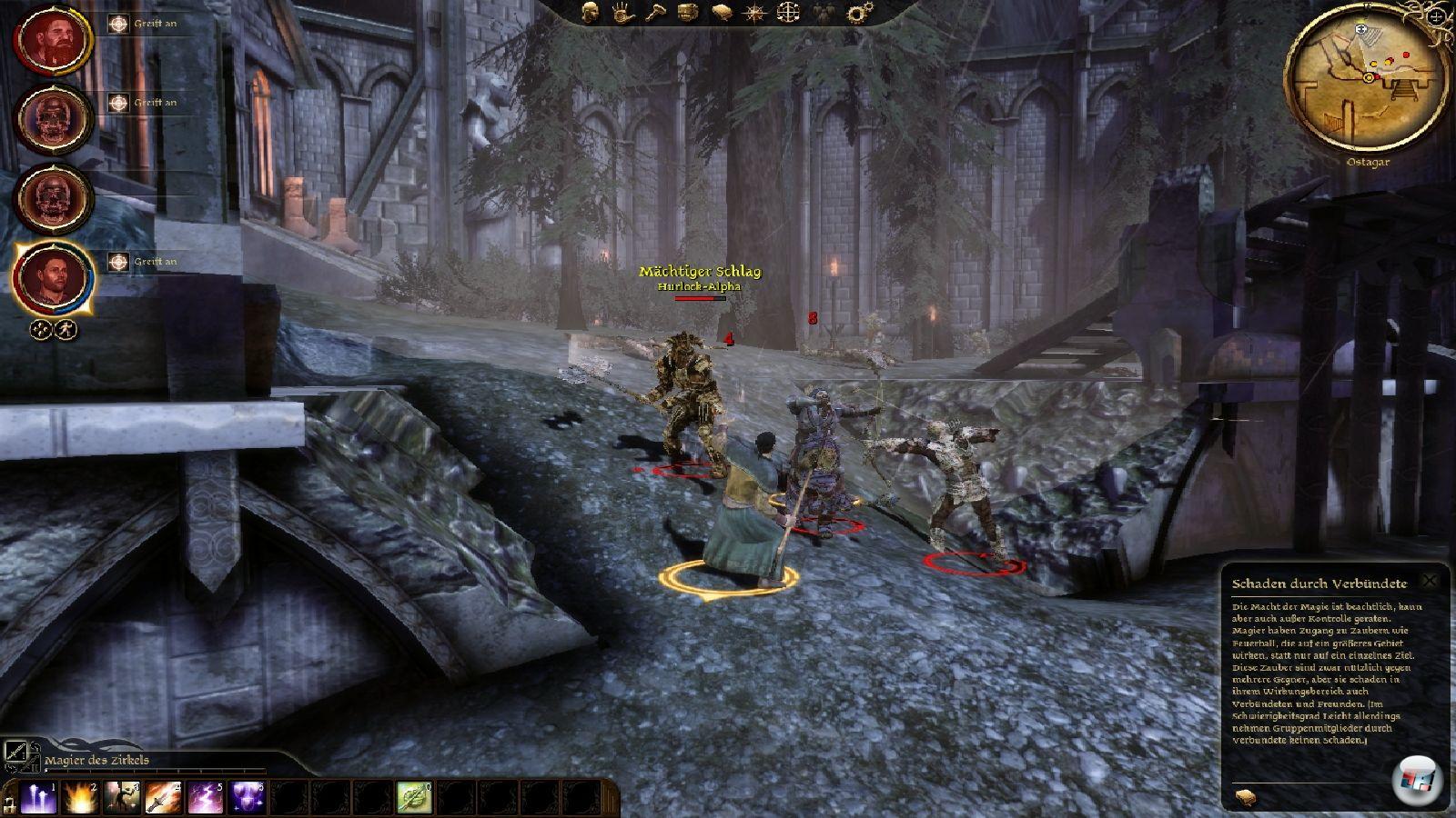 Erfreulich ist wiederum, dass man sich im weiteren Spielverlauf immer mehr von Tolkien lösen kann. Es ist letztlich viel weniger der Gelehrte aus Oxford, sondern der Schriftsteller aus Santa Fe, dessen Einflüsse innerhalb der Story deutlich werden: Die politischen Konflikte und Intrigen erinnern genau so angenehm an G.R.R. Martins Romanreihe „Das Lied von Feuer und Eis“ wie das plötzliche Sterben von Protagonisten – das wird so drastisch inszeniert, dass man regelrecht schockiert ist. Man muss natürlich auf dem Teppich bleiben: Zwar kann die Erzählstruktur in ihrer Komplexität nicht mit den Rosenkriegen oder Ähnlichem mithalten, aber die Verknüpfung von alltäglichen Missionen und hoher Politik ist sehr gelungen. Wenn man mit seinen Gefährten an bestimmte Schlüsselpunkte gelangt, zeigen kleine Filme, was gerade auf der königlichen Bühne geschieht, dass einem Meuchelmörder auf den Hals gehetzt werden oder welche Gebiete die dunkle Brut erobert hat – man hat das angenehme Gefühl, dass sich alles bewegt und zuspitzt, dass man beobachtet und verfolgt wird. Erinnert sich jemand an die Überfälle in Baldur’s Gate? Genau das gibt es hier auch. Dragon Age ist also nicht nur eine spröde und spät zündende, sondern auch eine üppige Schönheit mit so vielen inneren Werten, dass eine konturlose Wand hier oder eine Abkupferung da irgendwann als ärgerliche Kleinigkeiten verpuffen. Denn das Spiel selbst ist in einigen anderen Bereichen grandios.