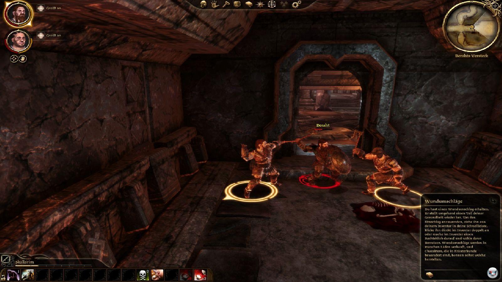 Wie ist das Kampfsystem? Wie laufen die Gefechte ab? Ähnlich taktisch wie in Neverwinter Nights <a class="DYNLINK" onmouseover="DynToolTipp_Show('Klicken für Gameinfos‚)“ onmouseout=“DynToolTipp_Hide(); “ href=“javascript:DynCont_Display(‚Gamefinder‘,’runmod.php?sid=%7BSID%7D&LAYOUT=dyncont_gf&spielid=963′)“>: Man kann jederzeit pausieren, um seinen Gefährten Befehle wie Bewegung, Waffenwechsel, Angriff oder Tranknutzung zu geben – hier auch im Video. Wirken die Kämpfe zu Beginn noch relativ einfach, weil es meist reicht, alle Leute auf die Gegner zu hetzen, steigt der Anspruch spätestens nach der Öffnung der Weltkarte, so dass man immer dermaßen ins Schwitzen oder Unterzahl gerät, dass man umkehren und abbrechen muss; und das ist auch gut so.