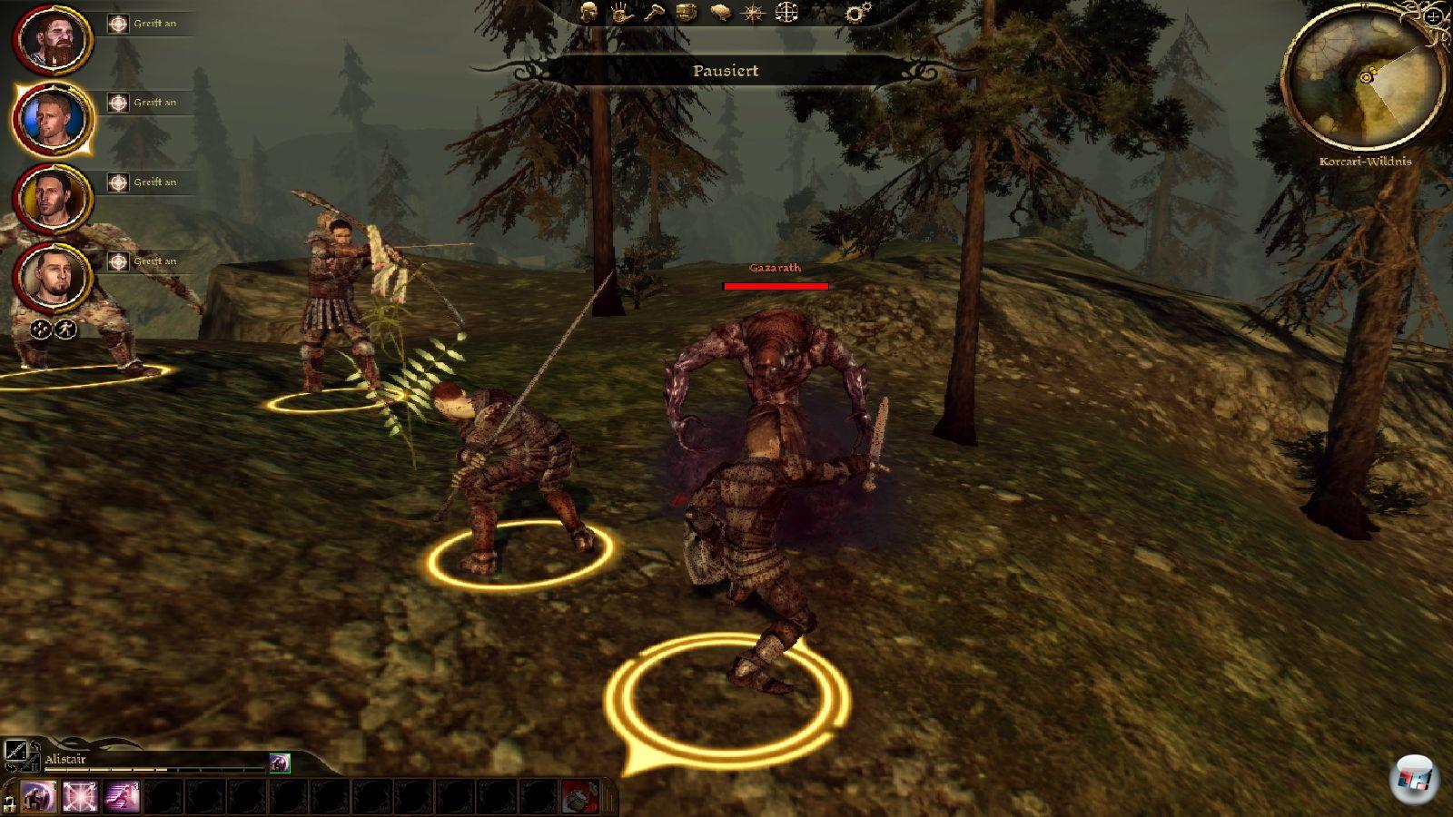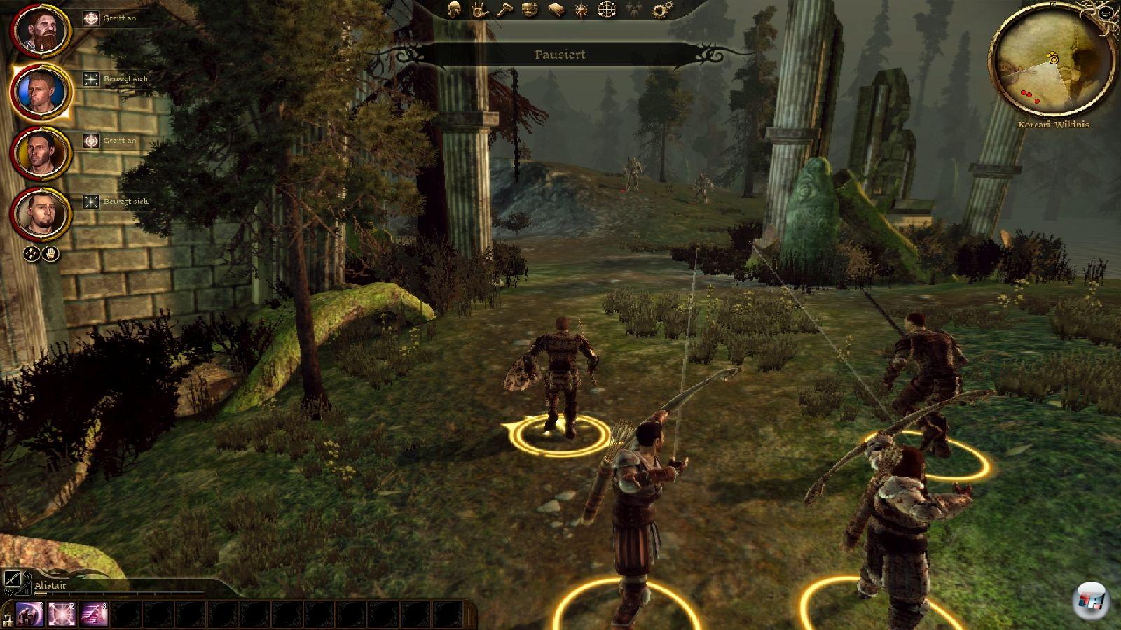bauen: Wähle bei Feindkontakt deine Fernkampfwaffe, nimm nach 50% Lebenspunkteverlust einen Heiltrank, schütze den Heiler, konzentriere dich beim Beschuss auf Magieanwender. BioWare hat hier genug Verhaltensmuster von „aggressiv“ bis „defensiv“ in petto, die man sehr komfortabel anpassen kann. Schade ist allerdings, dass BioWare keine Finessen wie etwa Trefferzonen mit unterschiedlichen Verletzungen oder Flucht bei Moralverlust anbietet – das hätte das Kampfsystem enorm aufgewertet.