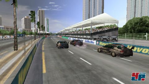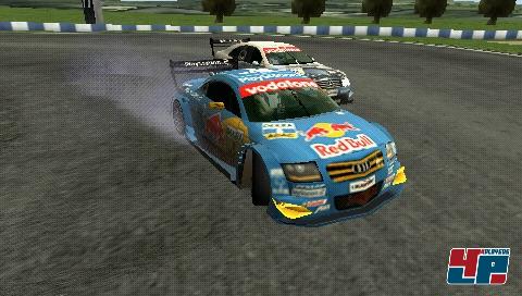 Challenge oder dem Seat Leon Cup Aufmerksamkeit bei Sponsoren zu wecken und Preisgelder für den Zugang zu neuen Rennserien zu sammeln, für die leistungsfähigere Boliden benötigt werden. So startet ihr z.B. auch bei diversen Truck Grand Prix, brettert wie Colin McRae über Rallye-Pisten, liefert euch in Stock- und Super Cars aufregende Duelle oder nehmt sogar in Formel-Wagen Platz. Natürlich ist auch die DTM vertreten, doch müsst ihr mit älteren Fahrzeugmodellen (z.B. Abt Audi TT) und Fahrern Vorlieb nehmen, da die aktuelle Lizenz der Saison 2005 nicht enthalten ist. Oft habt ihr die Wahl, mit welcher Rennserie ihr eure Karriere fortsetzen wollt und nehmt damit Einfluss auf eure weitere Entwicklung als Rennfahrer. Die Story wird von stimmungsvollen Render-Zwischensequenzen begleitet, die für das passende Renn-Ambiente sorgen und auch einen Blick hinter die Kulissen erlauben. Um das Setup eures Boliden braucht ihr euch keine Sorgen zu machen, denn dieses wird im Storymodus genau so automatisch festgelegt wie die Startposition und der Wagen, mit dem ihr an den Start geht. Dadurch seid ihr gezwungen, euch mit den insgesamt 38 lizenzierten Fahrzeugen auseinanderzusetzen, die alle über individuelle Fahreigenschaften verfügen. Es ist schon ein gewaltiger Unterschied, ob ihr hinter dem Steuer eines schwerfälligen Trucks, driftenden Rallye-Boliden oder wendigen Formel-Flitzer sitzt und es erfordert manchmal viel Feingefühl und Übung, gerade die leistungsstarken Wagen unter Kontrolle zu halten. Hier vermisst man eindeutig die analoge Tastenabfrage der Heimkonsolen, die die PSP leider nicht bieten kann. Dennoch stellt sich nach einerkurzen Eingewöhnungszeit ein prima Fahrgefühl ein, bei dem die Anforderungen an den Fahrer zwar hoch aber nicht übertrieben realistisch erscheinen. Bei der Lenkung scheint der Analogstick in manchen Rennklassen etwas überempfindlich zu reagieren, doch kann man in diesem Fall einfach auf das Digi-Pad als Lenk-Alternative zurückgreifen. Für das optimale Rennerlebnis haben die Entwickler dem Spiel vier Perspektiven spendiert: Neben der obligatorischen Außen- und Stoßstangenperspektive findet sich außerdem noch eine Motorhauben sowie eine Cockpitansicht mit Windschutzscheibe – damit sollte für jeden etwas dabei sein. Ein besonderes Lob gebührt der Tonabteilung, denn jeder Bolide scheint einen eigenen Motorsound spendiert bekommen zu haben, der selbst über den internen PSP-Lautsprecher richtig schön kernig daher kommt. Auch andere Geräusche, z.B. beim Abkommen von der Strecke oder bei Kollisionen sind hervorragend gelungen und vermitteln das Gefühl, tatsächlich in einer PS-starken Rennmaschine unterwegs zu sein.