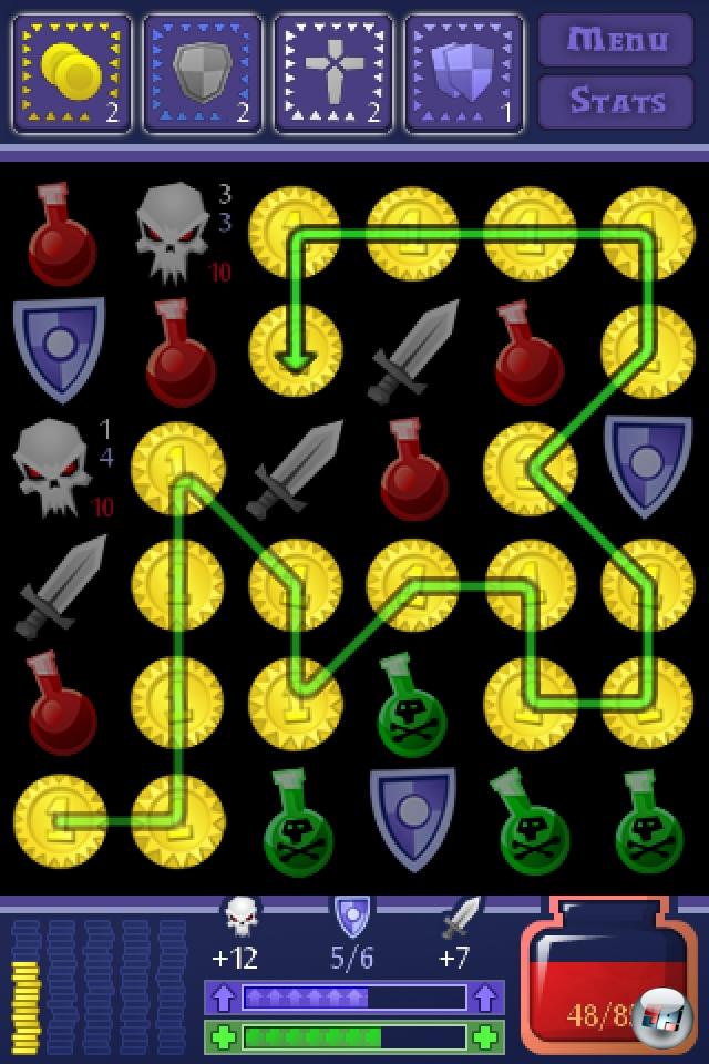 Der Spieler hat vier Steinarten auf seiner Seite: Schwerter, Schilde, Heiltränke, Goldstücke. Letztere schaufeln logischerweise Geld aufs Konto, für das man, sobald eine bestimmte Grenze erreicht ist, ein Item kaufen darf. Tränke heilen den Spieler; Schilde reparieren in erster Linie die Rüstung, haben aber noch einen Zusatzeffekt: Ist die Rüstung schon auf voller Stärke, fallen die Schildpunkte dem Upgrade-Kontingent zu – und ist das gefüllt, darf man unter zwei Bonus-Items wählen. Von denen gibt es mehr als 400, die per Zufall ausgewählt werden: Neue Waffen und Rüstungsteile, mehr Lebensenergie oder bessere Verteidigungswerte, Umwandler (mit denen man z.B. Schwerter in Münzen verwandeln kann) oder Einsammler, die auf Knopfdruck alle Steine einer Sorte einsacken. Manche Items wirken sich direkt auf den Spieler aus (wie mehr Lebensenergie), manche werden nur bei Bedarf aktiviert. Von denen darf man gleichzeitig maximal vier haben, außerdem benötigen sie nach ihrer Anwendung eine gewisse »Cooldown«-Zeit, die mehrere Runden dauert. Was uns zum wichtigsten Spielstein bringt: Dem Schwert.
