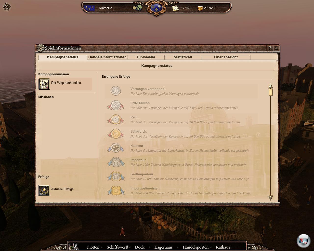 bekommt man laufend Tipps, was man machen muss. Sonst ist „learning by doing“ angesagt, so dass man die Anleitung nicht unbedingt lesen muss. Zudem ist in der Kampagne das Gerüst vorgegeben, wo man innerhalb weniger Jahre Aufgaben erledigen muss. Einen Hafen erobern, eine Flotte ausrüsten oder eine bestimmte Menge einer Ware ranschippern. Wenn man sich nicht verzettelt, ist das auf Schwierigkeitsstufe „normal“ leicht zu schaffen. Am Anfang sollte man so wenig wie möglich Geld ausgeben, da auch laufende Kosten zu bestreiten sind. Wenn man die Garnison einer Niederlassung vergrößert, steigen auch die jährlichen Ausgaben.
