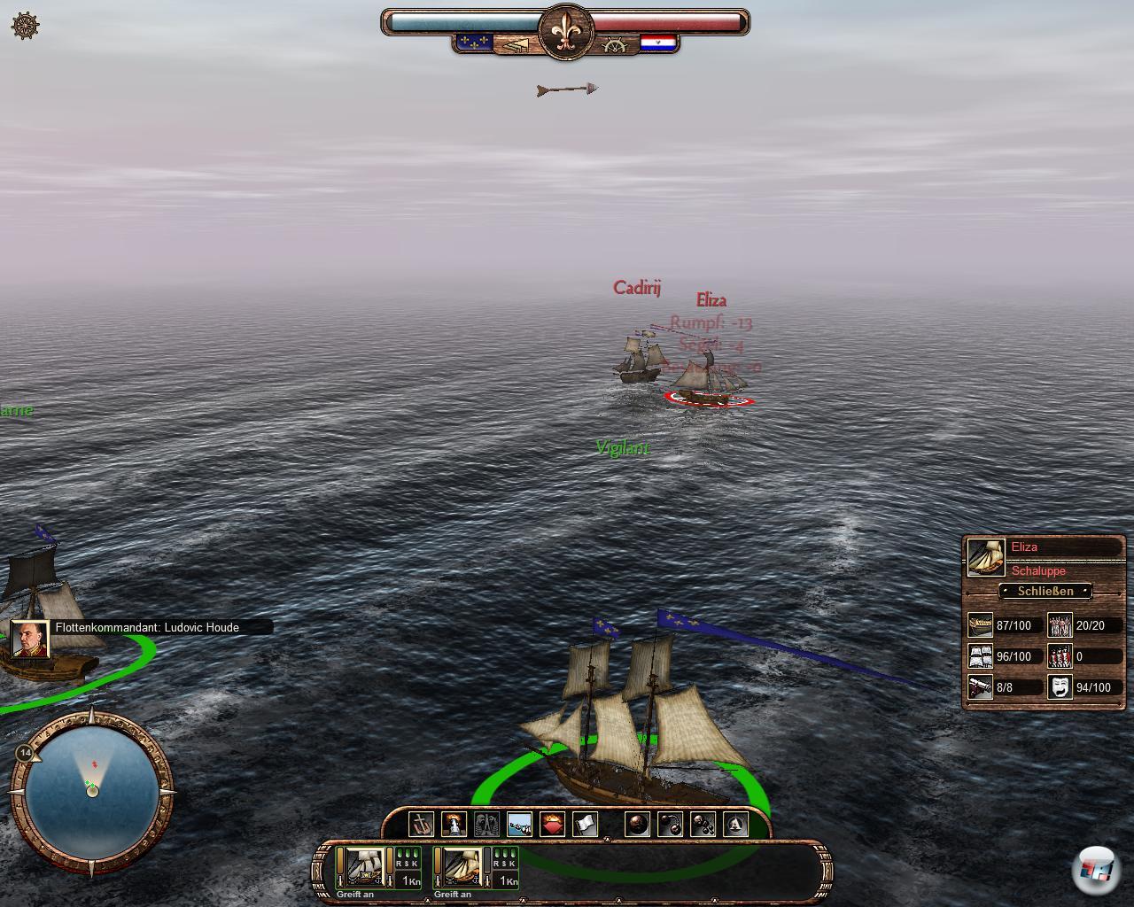 eine Anzahl Schiffe zu kapern oder zu versenken. Man kann auch nur eine Schlacht spielen, was eine Option im Menü ist. Das können Feinde sein, denen man den Krieg erklärt hat, oder -was häufiger vorkommt- man stößt auf Piraten, die ihre Häfen bei Ostafrika haben. Die Seeschlachten erinnern sofort an Empire: Total War, ohne aber dessen Ausgefeiltheit zu erreichen: Man klickt auf den Feind und der Rest passiert von alleine. Die tollen Spezialfähigkeiten der Kapitäne erweisen sich als sinnlos, denn man gewinnt auch so. Wenn man die besseren Schiffe hat, ist das kinderleicht. Sonst alles wie gehabt: Wie bei Pirates! gibt es drei verschiedene Sorten von Kanonenkugeln, die Rumpf, Männer oder Takelage beschädigen. Ist man nah genug dran, kann man entern. Nach der Schlacht sollte man die Schiffe reparieren, da sie durch den Beschuss beschädigt sind. Vom normalen Betrieb verschleißen sie aber nicht.