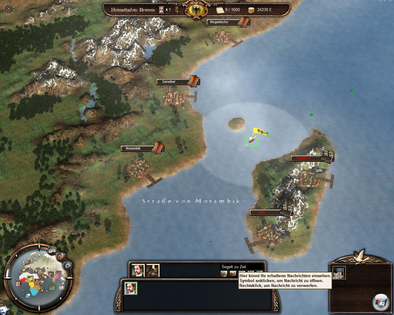 sich stetig verbessert. Auch die Schiffe werden immer besser beim Navigieren. Dann klickt man einen Hafen in Fernost an, was nicht immer sofort klappt, weil die Maussteuerung ungenau ist. Die Flotte setzt sich in Bewegung, wobei sich ihre Geschwindigkeit nach dem langsamsten Schiff richtet. Da sie die Strecke nicht auf einmal schafft, muss man unterwegs anlegen, was automatisch passiert. Das kann sie aber nur in neutralen Häfen, die nicht anderen Nationen gehören. Später muss man Häfen erobern, die als Stützpunkte dienen. Aus einem bekannten holländischen Stützpunkt entstand etwa die Kapkolonie und schließlich Südafrika.