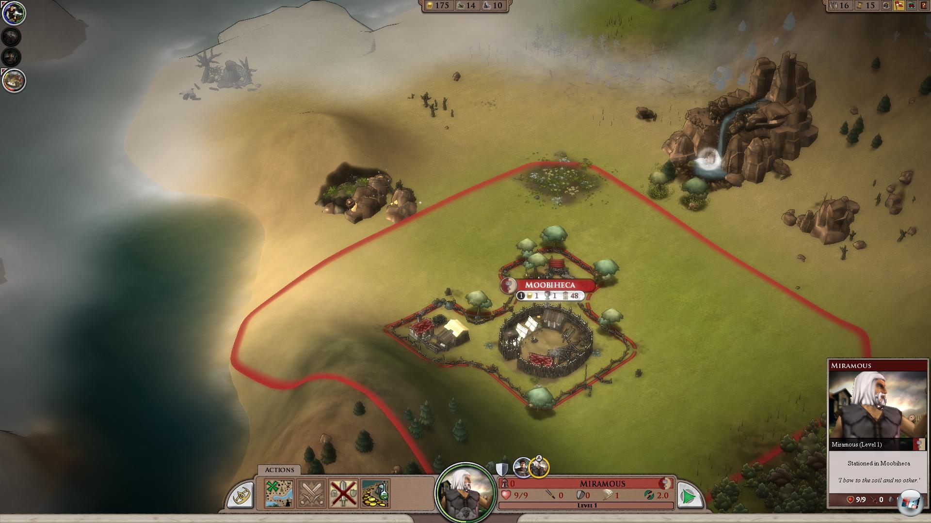 Sie ist wenig mehr als ein Bretterverhau am Ende der Welt, der von ein paar Unentwegten bewohnt wird. Allerdings wächst der Ort recht schnell, was den Einflussbereich vergrößert. Hier wird man gleich an Civilization erinnert, denn die Stadt wird nur größer, wenn die Leute was zu beißen haben. Neben Nahrung gibt es auch noch andere Ressourcen wie Baustoffe, Erz und Gold, die man erst durch die entsprechenden Bauten fördern kann. In der Kampagne lernt man das alles von den Leuten, auf die man in der eher kahlen Landschaft trifft und die man in die Party aufnehmen kann. Das ersetzt das Erforschen, das nur außerhalb der engen Kampagne funktioniert.