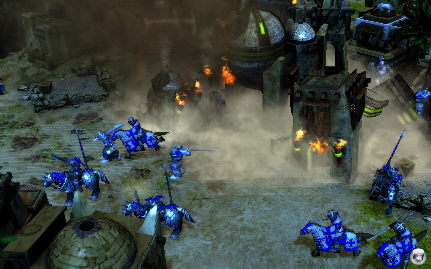 Und was erwartet euch im Scharmützel für eine Computerintelligenz? Die ungepatchte Verkaufsversion hinterlässt – auch hier – einen schlechten Eindruck, wobei man nicht trennen kann, ob die KI unfertig, bugverseucht oder schlichtweg unfähig ist. Zwar schaffen es die Computergegner meistens eine Basis aufzubauen (kein Wunder bei der Vereinfachung) und manchmal mit Mauern und Türmen zu schützen, jedoch vergessen sie dabei irgendwie die Einheitenproduktion. Oftmals kann man in aller Seelenruhe eine Basis aus dem Boden stampfen, bekommt ohne neutrale vorplatzierte Gegner keine Feinde zu Gesicht und werdet mit viel Glück mal angegriffen, sofern der Computergegner erstens eine Armee hat und zweitens die Recken den Weg zu eurer Basis gefunden haben und falls doch, dann suchen die Feinde keinen Weg um die Verteidigungsanlagen herum, sondern laufen direkt rein.