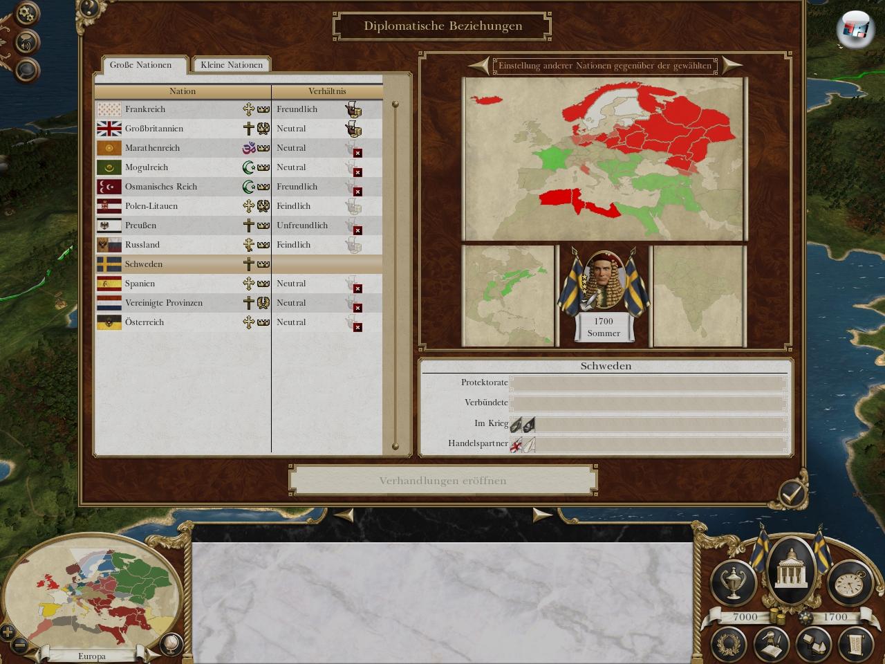 Aktuelle Bündnisse und Beziehungen lassen sich im Diplomatiefenster beobachten. Hier kann man Handelsveträge vereinbaren, Geschenke machen oder Tribut fordern.