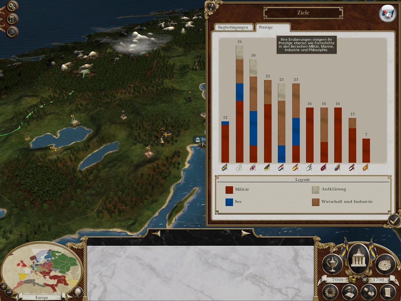 Wer seine Betriebe ausbauen will, muss auch die wirtschaftliche Forschung voran treiben, um z.B. Webtechniken, Minenbau oder Viehhaltung zu nutzen – ansonsten stagnieren die Einnahmen. Aber zu Beginn hat man meist nur eine Schule, in der eine Richtung studiert werden kann. Es gibt jedoch drei Zweige der Forschung, darunter auch das Militär, das sich direkt auf die verfügbare Bewaffnung und Formationen auswirkt, sowie die Philosophie, die sich auf die drei möglichen Regierungsformen (Monarchie, konstitutionelle Monarchie, Republik) oder gesellschaftliche Entwicklungen wie Rebellionen oder die Aufklärung auswirkt. Auf welchen Bereich will man sich konzentrieren? Wenn man als Spielmodus den Prestigesieg gewählt hat, wirken sich Errungenschaften in allen Bereichen auf die Punktzahl aus. Man kann zwar nichts auf der Südhalbkugel der Welt erobern, aber z.B. mit Brasilien oder Madagaskar lukrativen Seehandel betreiben – auch das kann das Zünglein an der Waage sein, wenn man seine Forschung beschleunigen oder seine Armeen zügiger ausheben will.
