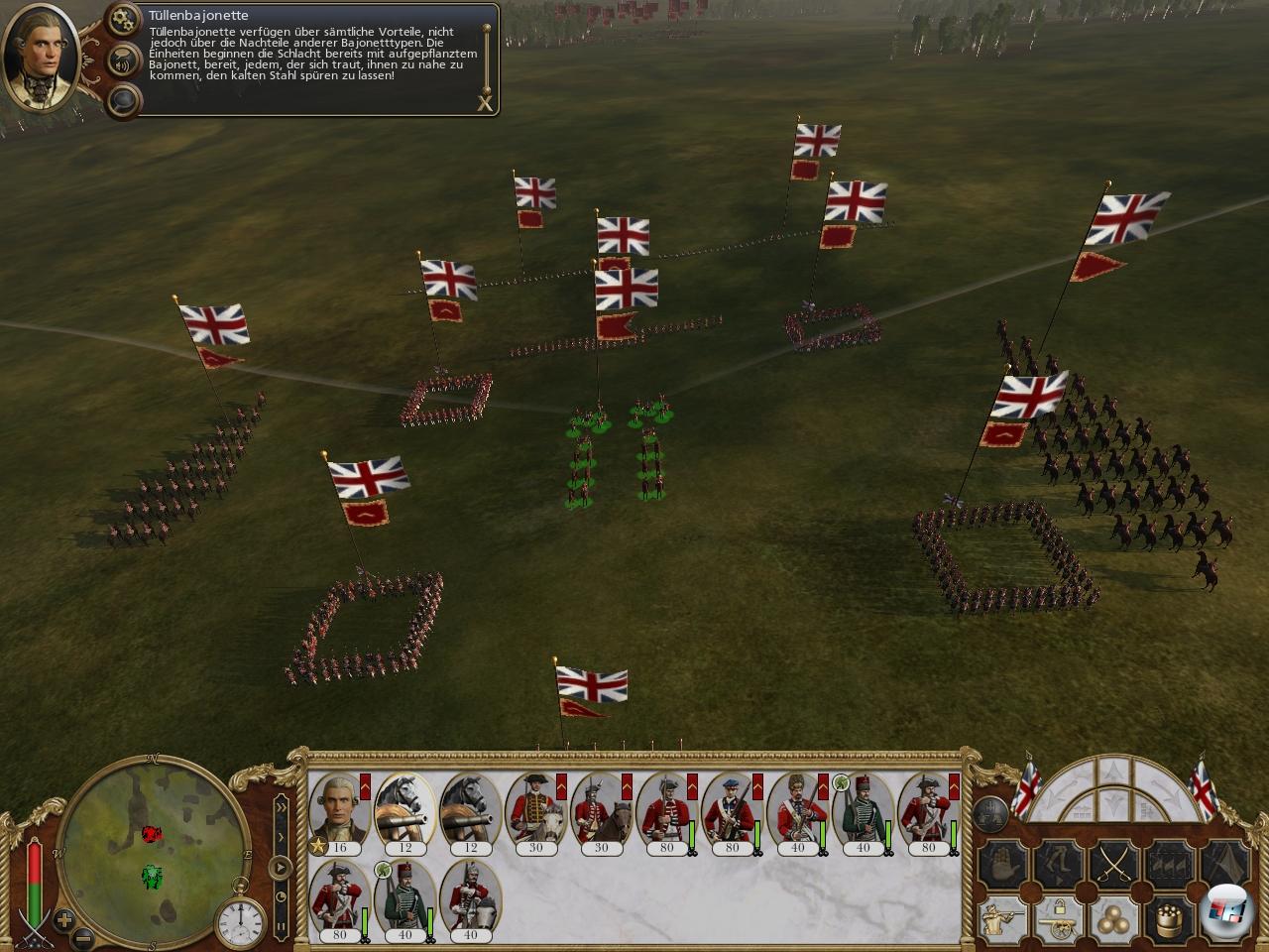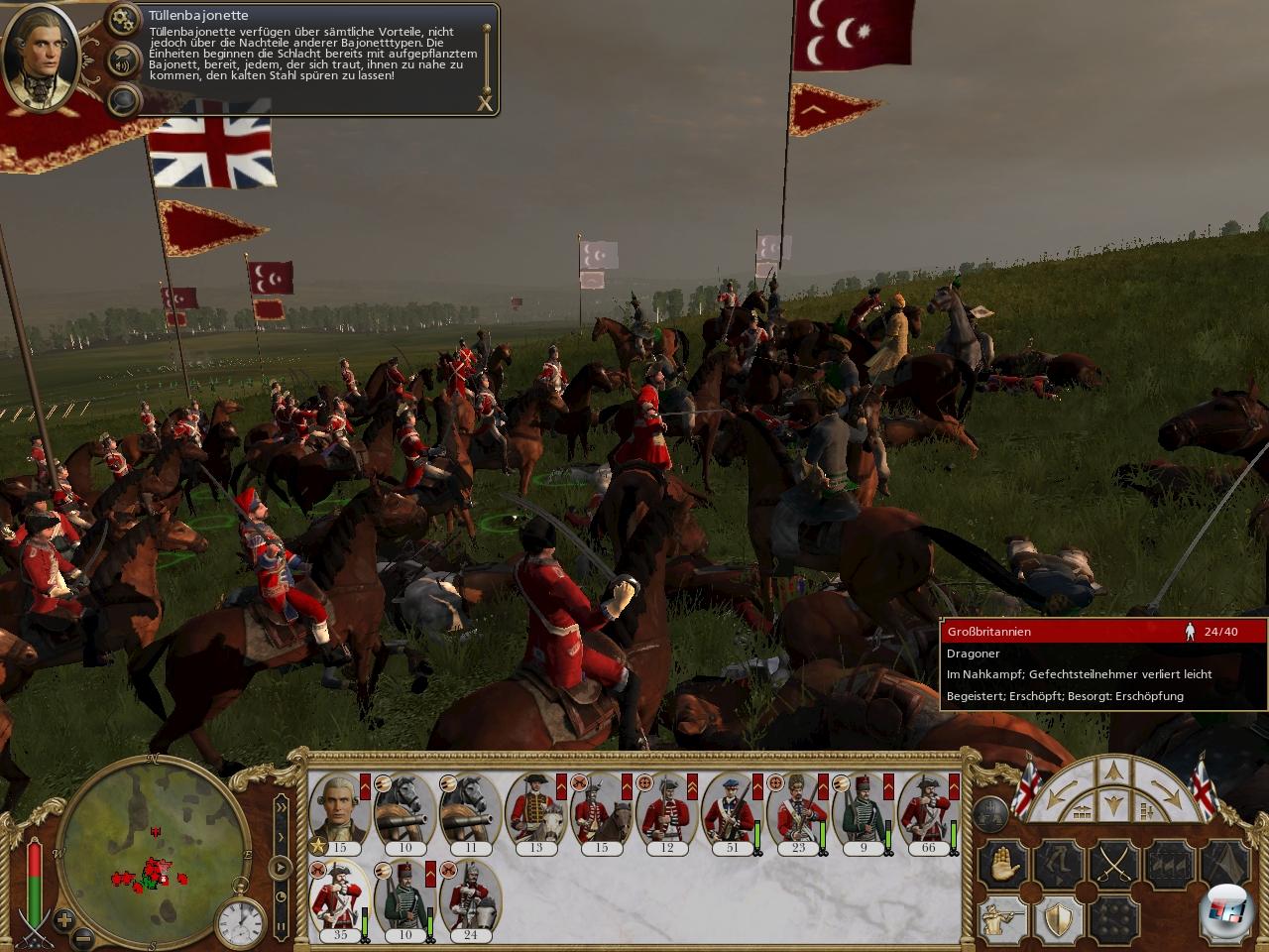 Die Königseinheit dieser Epoche ist jedoch die Linieninfanterie. Diese disziplinierte Einheit sorgt richtig aufgestellt und positioniert für verheerenden Schaden beim Feind – vor allem, wenn man Taktiken wie das gleichzeitige Vorrücken und Schießen anwendet oder drei Einheiten dieses Typs zu einem tödlichen Korridor aufbaut, der sich unterstützt und den Feind quasi über Kreuz trifft. Da die Geschosse aus den Musketen und Kanonen ballistisch genau berechnet werden, prallen sie auf Hindernisse wie Mauerwerk oder Holz, aber auch in die eigenen Reihen; also muss man auf die Abstände und Winkel achten, so dass die Kriegführung fast eine geometrische Komponente gewinnt. Und selbst wenn die Kavallerie ihre Flanken bedroht, kann diese Einheit über die rasche Bildung eines defensiven Quadrats und aufgepflanzte Bajonette fast wie eine Einheit Pikeniere Stand halten und feuern – wer mehrere dieser Quadrate so aufbaut, dass sie sich gerade außerhalb der eigenen Schussweite befinden und so Schaden unter eigenen Leuten verhindern, kann selbst einen Angriff von Husaren in Keilformation zurückschlagen.